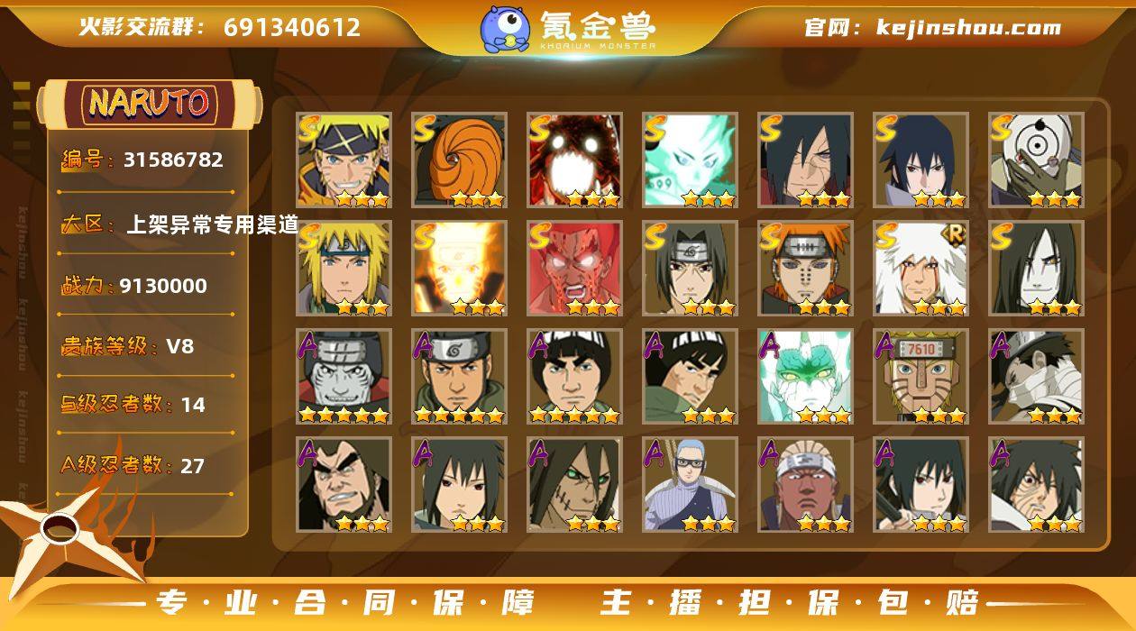 134个忍者,含14个强力S忍(鸣人、佐助、带土、大蛇丸等主流强势角色)+ 高人气A忍,PVP/PVE都能打,无需漫长养成,上手就能玩! 账号无封禁、无找回风险,资料齐全可换绑,支持平台担保交易,安全可靠。 适合想直接体验高段位、不想从零刷忍者的玩家,也适合火影IP粉丝收藏。诚心购买可议价,价格好谈!