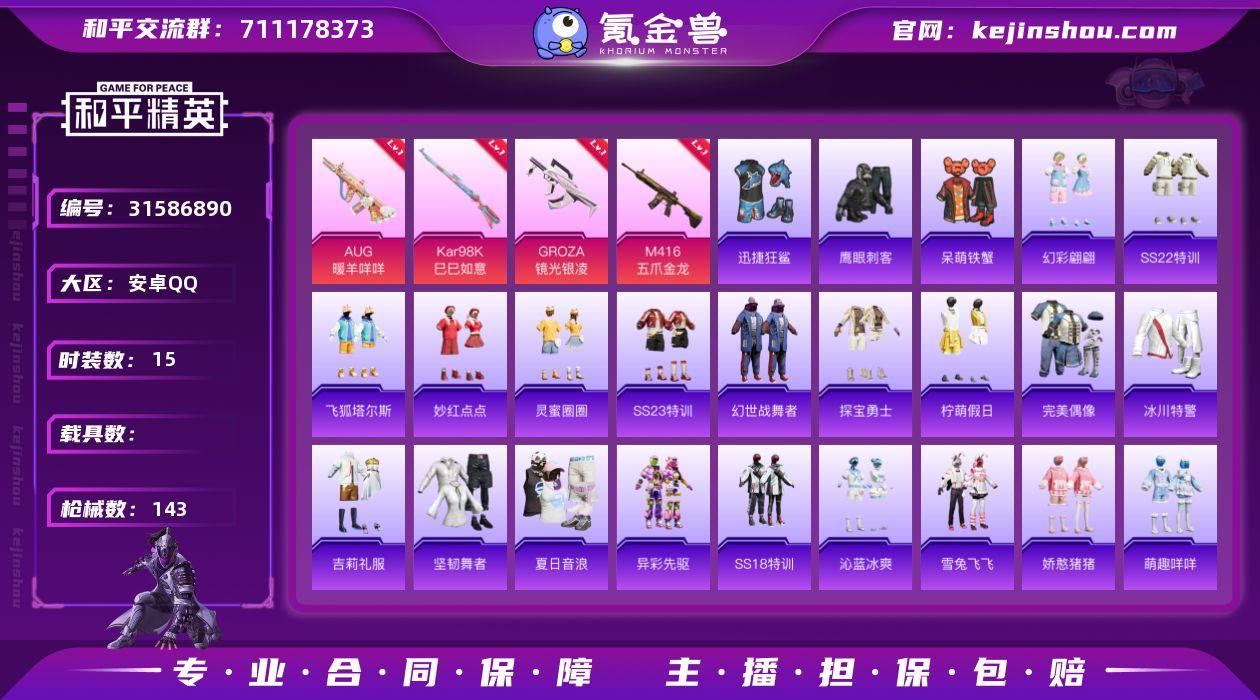 HX8975【身法素材号-6特效枪1粉装1稀有5王牌印记-84套装143枪皮39010热力值-地铁48点满天赋-M416-五爪金龙-迅捷狂鲨-智耀战神-AKM-百万伏特】Q等级36(2太阳)可二次 安卓Q-1稀有1粉装5特效枪6热门84套装143枪皮 39010热力值 5印记 历史超级王牌3星 【1稀有】 AKM-百万伏特 【1粉装】 智耀战神 【6特效枪】Mk14-福马献瑞 M416-五爪金龙 (5级) Kar98K-巳巳如意 (5级) AUG-暖羊咩咩 (5级) AMR-智耀战神 (3级) GROZA-镜光银凌 (5级) 【6热门】 龟仙人 呆萌铁蟹 鹰眼刺客 迅捷狂鲨 漫步者 破蛋小黄鸡 【1头盔】 木曜青龙头盔 【1背包】 深海小丑鱼背包安卓Q区-1粉装-6特效枪-39010热力值-5王牌印记-84套装-143枪皮【优质套装】: 智耀战神【特效枪等级】:AUG-暖羊咩咩(五级- AUG-暖羊咩咩)GROZA-镜光银凌(五级- GROZA-镜光银凌)Kar98K-巳巳如意(五级- Kar98K-巳巳如意)M416-五爪金龙(五级- M416-五爪金龙)【优质武器皮肤】: AUG-暖羊咩咩 GROZA-镜光银凌 Kar98K-巳巳如意 M416-五爪金龙【稀有武器皮肤】: DBS-乌木金纹 SCAR-L-海盐豹豹 AUG-暖羊咩咩 GROZA-镜光银凌 Kar98K-巳巳如意 UZI-冰河战士 M416-五爪金龙 蜜獾-乌木金纹 PKM-啾咪啾咪 M416-红色方程式 M416-蓝色火焰 M416-糯团青竹 M416-绯红前夜 M416-彩虹嘻嘻猴 AKM-百万伏特 AKM-彩虹符号 AKM-破晓战魂 AKM-龙的传人 AKM-萌趣颜团子 AKM-霓虹街区 SCAR-L-红色方程式 SCAR-L-玉兔迎春 SCAR-L-夜灯 M16A4-红色方程式 M16A4-蓝色火焰 M16A4-幻世战舞者 GROZA-异彩先驱 GROZA-恐龙拽拽 GROZA-懵萌河马 GROZA-彩虹符号 AUG-耀粉歌者 AUG-天降萌叽 QBZ-飞驰魅影 QBZ-