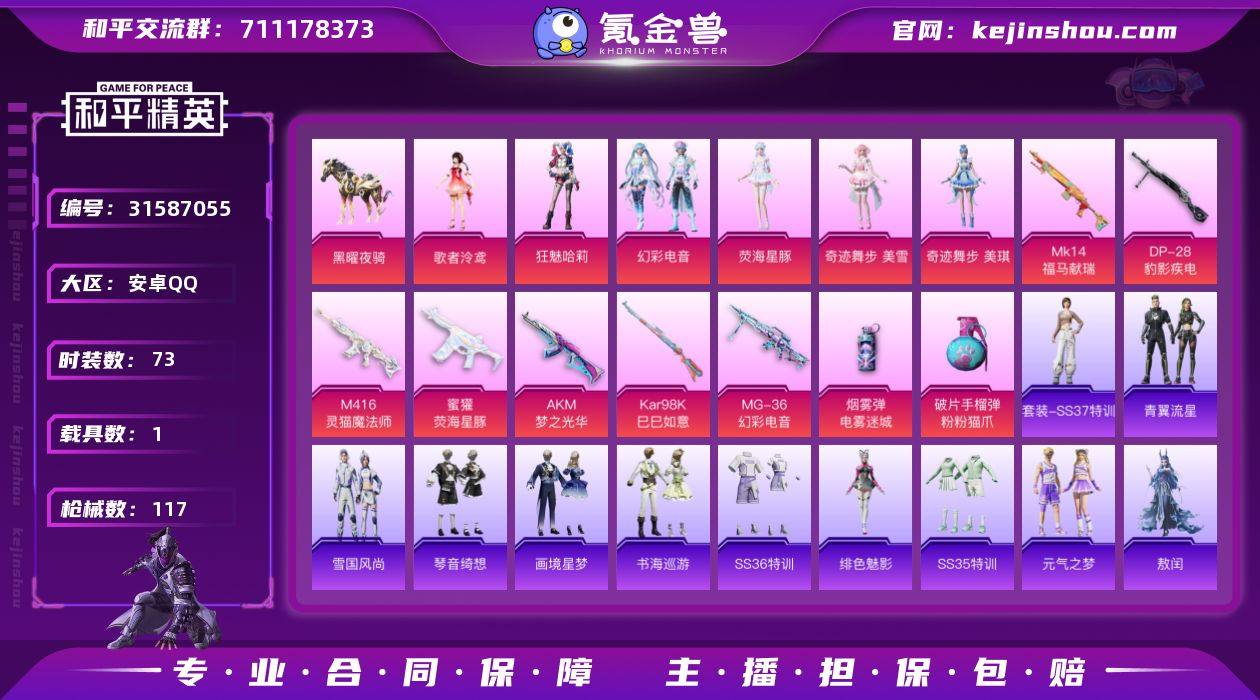 【56】安卓 手Q-1神装-3粉装-12特效枪-2载具-4粉色飞行器-46431热力值-1王牌印记-74套装-140枪皮 【红色神装等级】:盛世惊鸿-云鸾(一级) 【红色角色神装】:盛世惊鸿-云鸾 【热门品类】:粉装-梦幻火箭,角色-军刀雅典娜,角色-Mark.06 【粉色套装】:粉装-梦幻火箭,粉装-莲影清波,角色-女娲灵识 【粉色枪皮等级】:AKM-绿萝繁花(五级),SCAR-L-梦幻火箭(一级),SCAR-L-金蛇镇世(三级),M416-至情至圣(七级),M416-电玩时刻(五级),GROZA-镜光银凌(四级),AUG-暖羊咩咩(五级),M762-青锋波束(五级),UMP45-量子极限(五级),Kar98K-巳巳如意(五级),M24-莲影清波(四级),莫辛纳甘-未来领航者(三级) 【粉色载具】:盛世惊鸿摩托车,护世瑞兽 【粉色枪皮】:AKM-绿萝繁花,SCAR-L-梦幻火箭,SCAR-L-金蛇镇世,M416-至情至圣,M416-电玩时刻,GROZA-镜光银凌,AUG-暖羊咩咩,M762-青锋波束,UMP45-量子极限,Kar98K-巳巳如意,M24-莲影清波,莫辛纳甘-未来领航者 【粉色飞行器】:梦幻火箭飞行器,齐天大圣飞行器,凤舞九天飞行器,万象金身飞行器 【粉色降落伞】:梦幻火箭降落伞,环太平洋降落伞,闲梦青缨降落伞,圣堂之誓降落伞,江南烟雨降落伞,BEARBRICK降落伞,盛世惊鸿降落伞,金蛇镇世降落伞,月下星之子降落伞 【稀有套装】:套装-巳巳如意,套装-雏菊兔兔,套装-萝兰蝴蝶,套装-小熊娃娃,套装-糖糖葫芦,套装-青团波波,套装-棉花软糖,角色-许七安,套装-燕燕于飞,套装-鱼渊荷华,角色-绛羽幽主 【稀有枪皮】:AKM-环太平洋,AKM-龙的传人,M16A4-幻世战舞者,SCAR-L-夜灯,SCAR-L-炫彩节奏,SCAR-L-红色方程式,M416-糯团青竹,M416-蓝色火焰,AUG-天降萌叽,AUG-甜蜜菠萝,AUG-耀粉歌者,AUG-金蛇镇世,QBZ-彩虹符号,QBZ-绚金瑰梦,M762-天降萌叽,M762-暖熊萌萌,Mk47-妙红点点,Mk47-炫光之旅...