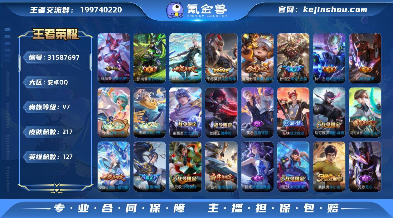 贵族等级:V7 典藏皮肤数:0 珍品无双皮肤数:0 无双皮肤数:0 珍品传说皮肤数:0 传说皮肤数:7 史诗皮肤数:48 皮肤数:217 英雄数:127 段位:星耀