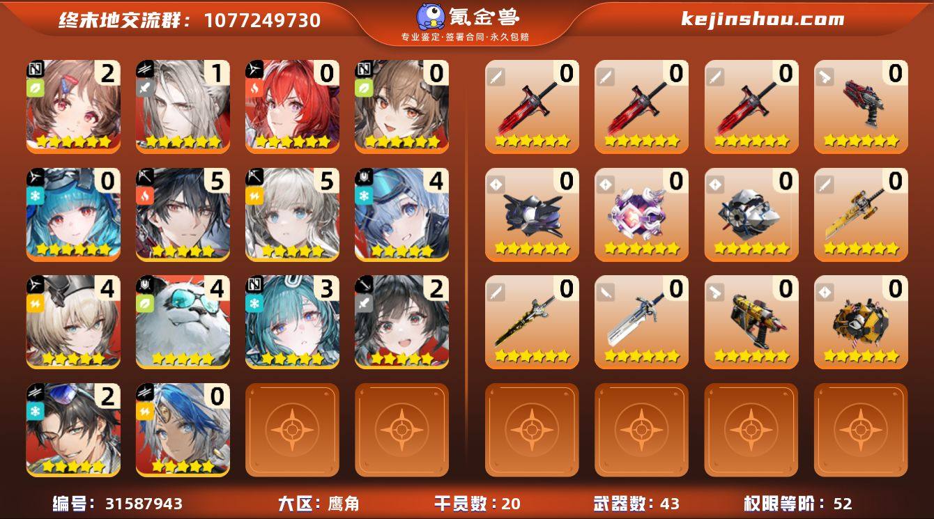 实在肝不动了,不想玩了,诚信卖,氪了大月卡和6元礼包,有3个武器箱没开,主线剧情已经过完了。基建武陵还没有动,四号谷地已毕业。