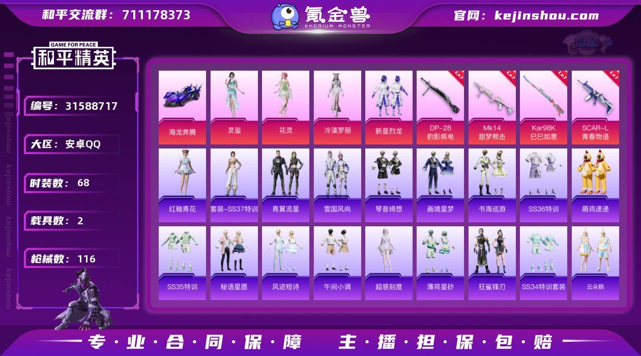 【kyhp907】安卓 手Q-4粉装-6特效枪-1载具-1粉色飞行器-72191热力值-16王牌印记-191套装-245枪皮 【热门品类】:粉装-梦幻火箭,粉装-音爆索尼克,角色-军刀雅典娜,套装-龟仙人,套装-暗影哥特 【粉色套装】:粉装-梦幻火箭,粉装-星之彼岸,粉装-音爆索尼克,粉装-星穹咏叹调 【粉色枪皮等级】:AUG-暖羊咩咩(五级),Vector-环太平洋(七级),Kar98K-巳巳如意(五级),Mk14-福马献瑞(四级),DP-28-圣堂之誓(七级),DP-28-豹影疾电(五级) 【粉色载具】:保时捷Panamera(星辰紫) 【粉色枪皮】:AUG-暖羊咩咩,Vector-环太平洋,Kar98K-巳巳如意,Mk14-福马献瑞,DP-28-圣堂之誓,DP-28-豹影疾电 【粉色飞行器】:星之彼岸飞行器 【粉色降落伞】:梦幻火箭降落伞,星之彼岸降落伞,环太平洋降落伞,第五大道降落伞,未来领航者降落伞,千金淑猫降落伞,临安公主降落伞,樱桃泡泡降落伞,星穹咏叹调降落伞 【稀有套装】:套装-龟仙人,玩偶服-酷勇熊大,玩偶服-憨乐熊二,套装-巳巳如意,套装-小鸟芋圆,角色-罗莉,套装-马上有钱,套装-糖糖葫芦,套装-青团波波,套装-棉花软糖,角色-都市丽猫,角色-摩登魅猫,套装-燕燕于飞,套装-鱼渊荷华,套装-风舞幻音,套装-粉恋花,套装-紫幽梦,套装-蓝冰羽,套装-朱霞炽焰,套装-凌霄紫焰,套装-擎苍青焰,套装-画境星梦,套装-琴音绮想,套装-雨过天青,套装-红釉青花,角色-唐三 【稀有枪皮】:AKM-夜灯,AKM-彩虹符号,AKM-影袭,AKM-恐龙拽拽,AKM-星之彼岸,AKM-环太平洋,AKM-生命誓言,AKM-破晓战魂,AKM-萌趣颜团子,AKM-虎虎生威,AKM-霓虹街区,AKM-龙的传人,M16A4-幻世战舞者,M16A4-红色方程式,M16A4-蓝色火焰,SCAR-L-夜灯,SCAR-L-玉兔迎春,SCAR-L-红色方程式,SCAR-L-银碳小老虎,SCAR-L-黄金龙骨,M416-糯团青竹,M416-红色方程式,M416-绯红前夜,M4...