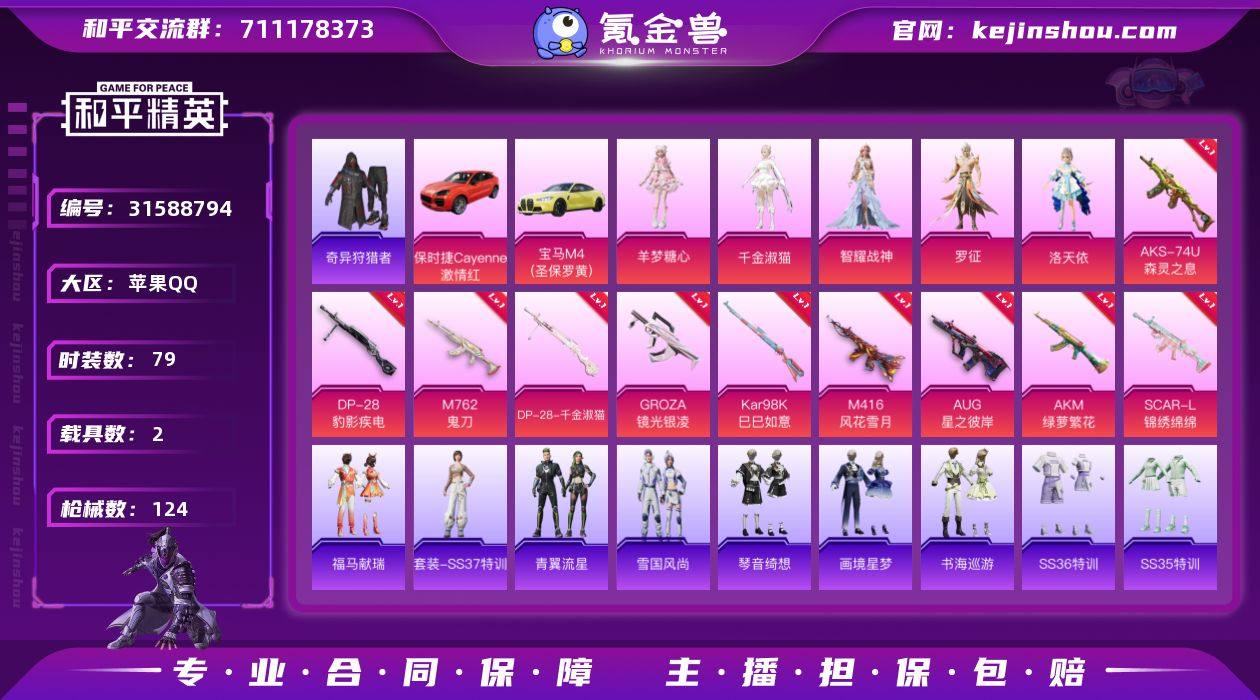 可二次实名【M4风花雪月洛天依10特效枪5粉装2载具 秒换绑不用等】 苹果Q区-43704热力值-7印记-79套装-124枪皮 【2载具】 保时捷Cayenne(激情红) 宝马M4(圣保罗黄)【5粉装】 洛天依 角色-罗征 角色-智耀战神 角色-羊梦糖心 角色-千金淑猫【10特效枪】 M416-风花雪月(4级) AKS-74U-森灵之息(5级) SCAR-L-锦绣绵绵(5级) AUG-星之彼岸(2级) AKM-绿萝繁花(5级) DP-28-千金淑猫(5级) Kar98K-巳巳如意(5级) M762-鬼刀(7级) GROZA-镜光银凌(5级) DP-28-豹影疾电(5级)【141热门】 破蛋小黄鸡 军刀雅典娜 SS27特训 SS26特训 SS25特训 M249-彩虹符号 MG3-幻世战舞者 长空猛禽 霓虹街区 S686-奇异狩猎者 海岛探路者 SKS-青瓷战姬 Win94-拳皇·狂花道 平底锅-画境星梦 顶瓜瓜 M249-无面战甲 雏菊兔兔 MG-36-薄荷星砂 SS34特训 朱霞炽焰 星渊小夜曲 S1897-荧海星豚 星影赞美诗 撬棍-冰晶雪宝 时希公主 大橘大利 彩虹兔 SCAR-L-冷漠罗丽 凌霄紫焰 SS29特训 萝兰蝴蝶 破片手榴弹-爆破雪人 SS30特训 ACE32-冰晶雪宝 青团波波 鱼渊荷华 糖糖葫芦 青翼流星 SS28特训 PKM-啾咪啾咪 燕燕于飞 SS31特训 SS33特训 SS32特训 巳巳如意 棉花软糖 M762-雏菊兔兔 雪绒豹 游乐 Mini14-雏菊兔兔 R1895-雏菊兔兔 SS36特训 智谋强哥 战术大师 JS9-凌霄紫焰 MG-36-凌霄紫焰 ARX-凌霄紫焰 云朵鹅 GROZA-荧海星豚 P92-凌霄紫焰 S1897-精灵梦叶罗丽 平底锅-凌霄紫焰 Vector-创世·救赎 AKS-74U-鬼刀 M416-糯团青竹 甜心蒙太奇 MK20-H-星途旅人 M417-玩趣呆呆 Mk14-薄荷星砂 破片手榴弹-咒蚀之裁 燃烧瓶-福马献瑞 ACE32-画境星梦 Kar98K-顶峰精英 M1加兰德-画境星梦 琴音绮想 Min