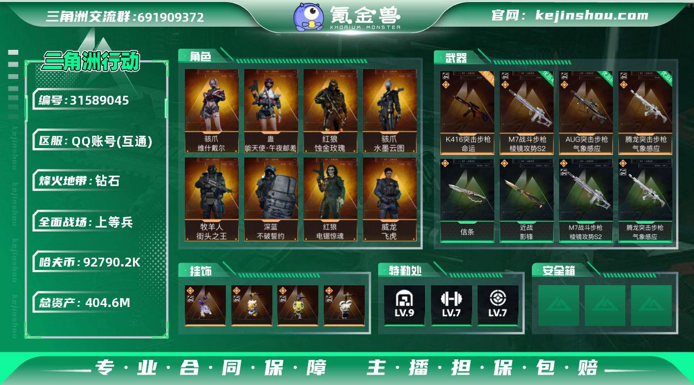 实名:不可二次实名 总资产:404.6M 哈夫币:92790.2K 烽火地带段位:钻石 烽火地带等级:60 全面战场段位:上等兵 全面战场等级:50 9级仓库,7级训练中心,7级靶场,6级指挥中心,2级潜水中心,3级防具台,3级工作台,3级制药台,3级技术中心,1级收藏室 战术部门等级:4 战斗部门等级:3 医疗部门等级:3 研发部门等级:3 后勤部门等级:3 曼德尔砖-气象感应:0 曼德尔砖-命运王牌:0 曼德尔砖-电玩高手:0 曼德尔砖-美杜莎:0