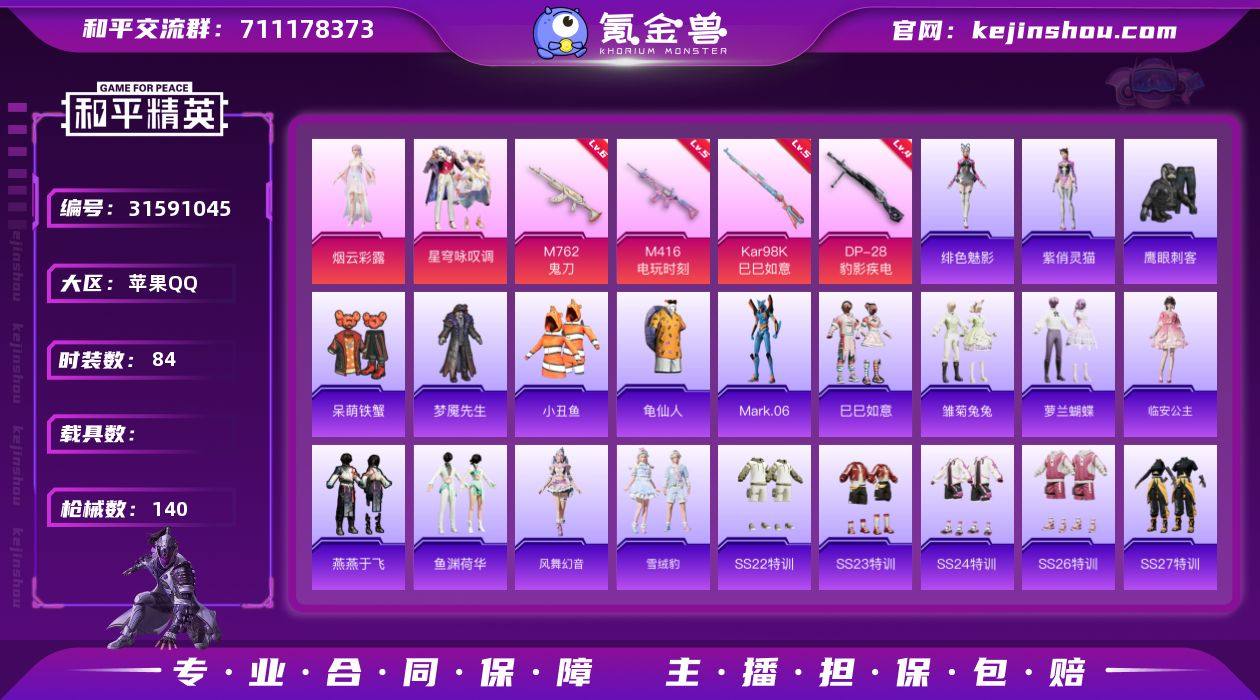 苹果 手Q-2粉装-6特效枪-0载具-3粉色飞行器-39509热力值-3王牌印记-84套装-140枪皮 【热门品类】:套装-小丑鱼,套装-龟仙人,角色-Mark.06 【粉色套装】:角色-烟云彩露,粉装-星穹咏叹调 【粉色枪皮等级】:M416-电玩时刻(五级),M762-鬼刀(六级),Kar98K-巳巳如意(五级),DP-28-豹影疾电(四级) 【粉色枪皮】:M416-电玩时刻,M762-鬼刀,Kar98K-巳巳如意,Mk14-福马献瑞,DP-28-豹影疾电 【粉色飞行器】:炫彩糖果飞行器,冠军兔兔飞行器,幻海精灵飞行器 【粉色降落伞】:仲夏莫吉托降落伞,圣堂之誓降落伞,沙丘之主降落伞,精灵梦叶罗丽降落伞,金丰海韵降落伞,精灵之光降落伞,鬼刀降落伞,戏水时光降落伞,幻彩电音降落伞,炫彩糖果降落伞 【稀有套装】:套装-龟仙人,套装-巳巳如意,套装-雏菊兔兔,套装-萝兰蝴蝶,角色-临安公主,套装-燕燕于飞,套装-鱼渊荷华,套装-风舞幻音,套装-雪绒豹,角色-绯色魅影,角色-紫俏灵猫,套装-雨过天青,套装-红釉青花 【稀有枪皮】:AKM-彩虹符号,AKM-影袭,AKM-环太平洋,M16A4-红色方程式,M16A4-蓝色火焰,SCAR-L-炫彩节奏,SCAR-L-红色方程式,M416-红色方程式,M416-蓝色火焰,GROZA-异彩先驱,GROZA-影袭,GROZA-懵萌河马,GROZA-田园牧歌,AUG-天降萌叽,AUG-甜蜜菠萝,AUG-耀粉歌者,M762-天降萌叽,Mk47-妙红点点,Mk47-洛神天依,G36C-懵萌河马,蜜獾-天降萌叽,UZI-啾咪啾咪,UZI-天降萌叽,UZI-影袭,UZI-红色方程式,UMP45-涂山之恋,UMP45-生命誓言,Vector-焰鹰斗篷,Vector-田园牧歌,汤姆逊-天降萌叽,汤姆逊-炫彩节奏,AKS-74U-鬼刀,P90-巳巳如意,Kar98K-影袭,Kar98K-红色方程式,Kar98K-诡娃娃,M24-影袭,AWM-焰鹰斗篷,SKS-炫彩节奏,SKS-迅猛狂鲨,VSS-田园牧歌,Mini14-炫彩节奏,Mini14-耀粉歌者,SLR-彩虹符号,莫辛纳甘-懵萌河马,...