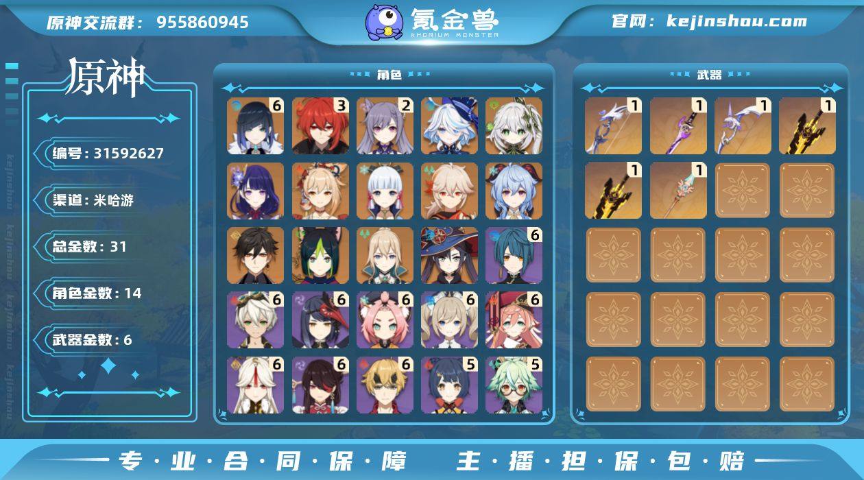 6命1精夜兰,练度不错,很久没玩了,钟离,万叶,雷神,神里凌华0+1,账号练度都还可以,就是老玩家退坑早,可以换绑手机