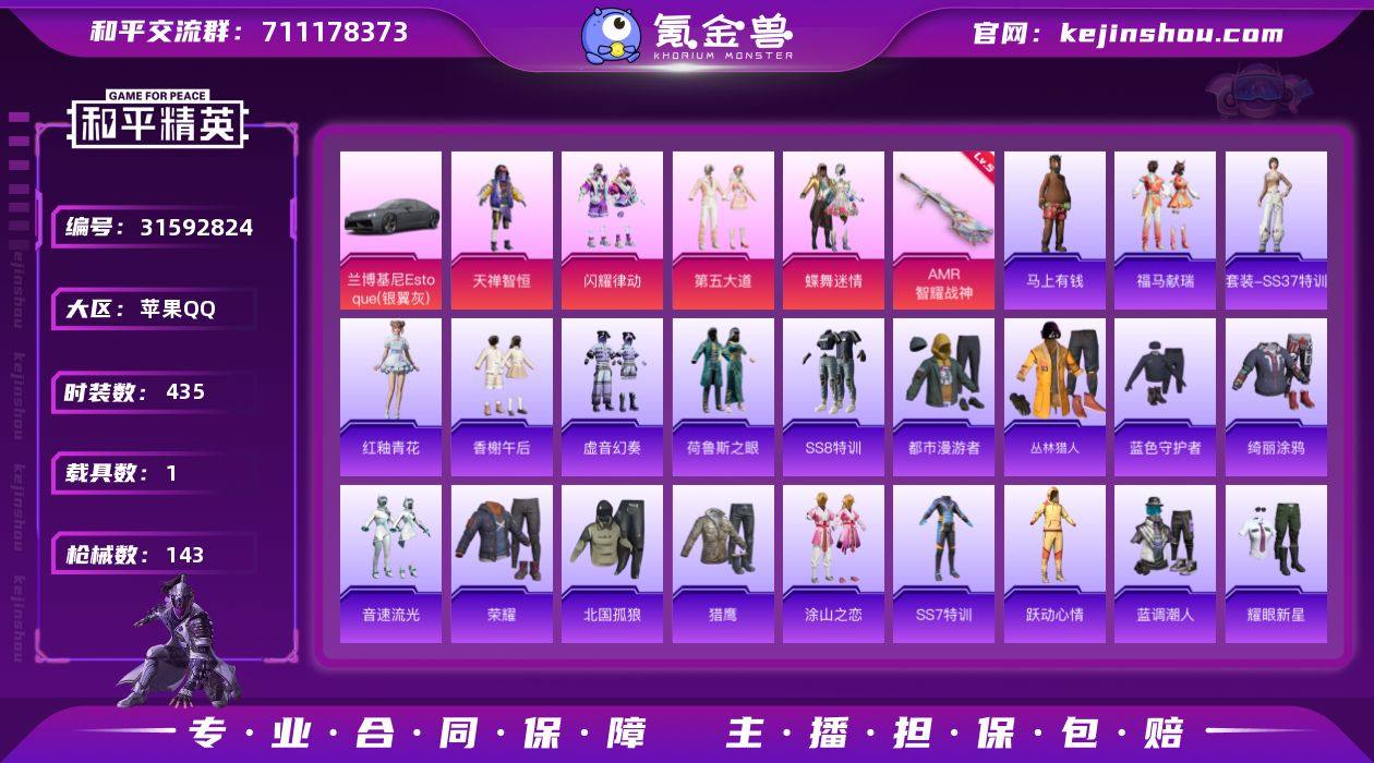 实名:可二次实名 是否支持人脸包赔:支持 粉装数量:4 特效枪数量:1 载具数:1 时装数:435 枪械数:143 第五大道,蝶舞迷情,闪耀律动,天禅智恒 五级AMR-智耀战神 兰博基尼Estoque(银翼灰) 马上有钱,福马献瑞,红釉青花,SS37特训,雨过天青,冰川特警,北国孤狼,滨海假日,长空猛禽,丛林猎人,传奇侦探,炽焰拳师,都市漫游者,淡雅花蕊,飞驰魅影,粉红小猪,疯狂小兔子,福星高照,格斗先锋,格斗专家,贵族骑装,虎虎生威吉莉,荷鲁斯之眼,黑色刀锋,黑色伏地魔,灰色格斗者,幻世战舞者,娇憨猪猪,竞技达人朋克,竞技名士,竞技勇士朋克,坚韧舞者,极速竞梦,精神漫游,机械征服者,军械专家,金耀舞者,蓝调潮人,龙的传人,猎鹰,玲珑飞花,猎梦纪元,蓝色守护者,蓝色运动,麻辣教官,懵萌河马,萌趣咩咩,霓虹极客,霓虹街区,怒火燎原,牛气满满,破蛋小黄鸡,青春校园,拳皇97八神庵,绮丽涂鸦,骑行爱好者,瑞龙福将,荣耀,神秘领域,神气柴柴,SS11特训,SS12特训,SS13特训,SS14特训,SS17特训,SS18特训,SS19特训,SS20特训,SS21特训,SS22特训,SS23特训,SS24特训,SS25特训,SS5特训,SS6特训,SS7特训,SS8特训,SS9特训,探宝勇士,甜蜜告白,涂山之恋,甜心亚梦,团圆交子,特战装甲,绚烂繁星,雪山精英,醒狮腾龙,核芯基因,香榭午后,虚音幻奏,异彩先驱,跃动心情,银河圣歌,音速流光,云纹魔法士,夜莺强袭者,耀眼新星,战地名士,智慧隐士 春暖花开降落伞,第五大道降落伞,繁花小夜曲降落伞,伏魔团降落伞,幻梦音符降落伞,恐龙拽拽降落伞,林间仙鹿降落伞,蓝莓炮弹降落伞,洛神天依降落伞,绮梦流光降落伞 卖家说:豪华手册一百多天特权卡老号带王者v5有幽冥眼