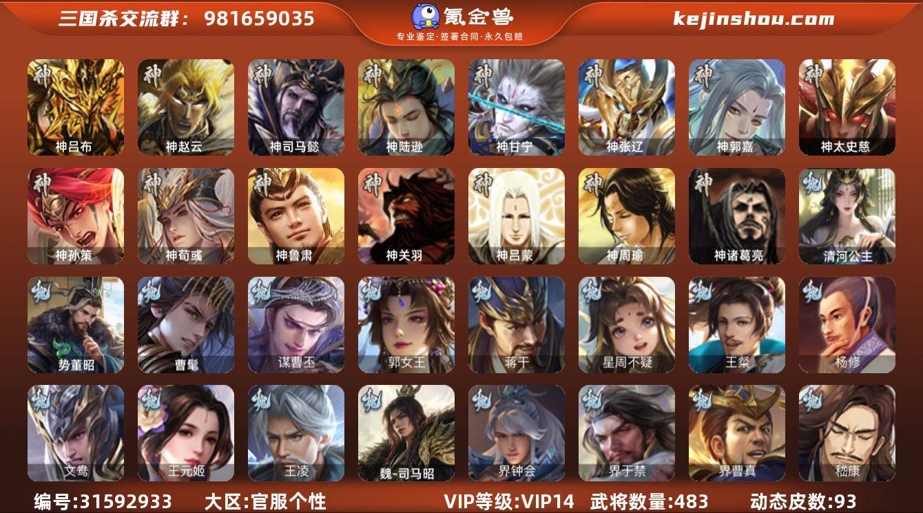 VIP等级: VIP14 官阶: 大将军 武将数量: 483 动态皮肤数量: 93 神将: 神甘宁,神郭嘉,神陆逊,神吕布,神司马懿,神孙策,神太史慈,神荀彧,神张辽,神赵云,神关羽,神吕蒙,神周瑜,神诸葛亮,神鲁肃 魏国武将: 刘晔,戏志才,曹纯,曹婴,陈琳,程昱,郝昭,嵇康,界曹真,界于禁,界钟会,魏-司马昭,王凌,王元姬,文鸯,杨修,王粲,唐咨-魏,张辽,SP蔡文姬,SP曹仁,SP关羽,SP贾诩,SP姜维,SP庞德,卞夫人,蔡贞姬,曹昂,曹操,曹冲,曹洪,曹丕,曹仁,曹叡,贾逵,王异,张恭,鲁芝,界满宠,曹休,界曹植,满宠,荀攸,王基,钟繇,蒯越蒯良,郭嘉,牵招,荀彧,阮慧,杜畿,界郭嘉,崔琰,界曹丕,界荀彧,朱灵,界甄姬,辛毗,吕虔,界王异,界许褚,界郭淮,华歆,陈群,界邓艾,界典韦,司马孚,袁涣,李通,乐进,辛宪英,郭淮,毛玠,郭皇后,毌丘俭,夏侯惇,曹植,司马朗,谋于禁,界曹操,星周不疑,许褚,界张辽,谋徐晃,蒋干,张郃,钟会,文聘,郭女王,曹彰,界夏侯惇,诸葛诞,司马懿,甄姬,界徐晃,徐晃,孙资刘放,韩浩史涣,胡班,曹真,谋曹丕,典韦,界夏侯渊,谋荀彧,夏侯渊,李典,于禁,王双,邓艾,界司马懿,张春华,孟达-魏,臧霸,牛金,朱灵(国战),文钦-魏,曹髦,玄·毌丘俭,李昭焦伯,清河公主,司马伷,董昭,谋郭嘉,势董昭,谋张辽,谋夏侯渊 蜀国武将: 董允,花鬘,界黄忠,谯周,沙摩柯,王平,张星彩,赵襄,周群,诸葛瞻,谋马超,谋赵云,谋夏侯氏,谋黄忠,马云騄,谋黄月英,徐庶,界魏延,杨仪,吕凯,界关羽,界诸葛亮,邓芝,界伊籍,胡金定,费祎,严颜,界黄月英,界张嶷,赵云,张松,彭羕,李丰,界刘备,界刘禅,谋姜维,刘封,糜竺,李遗,谋庞统,黄月英,关羽,王甫赵累,吴懿,向宠,祝融,张飞,黄皓,陈震,魏延,界周仓,谋祝融,马忠,界法正,糜夫人,界孟获,刘禅,界赵云,谋诸葛亮,界姜维,张翼,关银屏,界祝融,SP孙尚香,SP徐庶,卧龙诸葛,宗预,周仓,简雍,界关兴张苞,诸葛亮,孙乾,界卧龙诸葛,法正,赵统赵广,陈到,界马岱,关平,马岱,界庞统,庞统,...