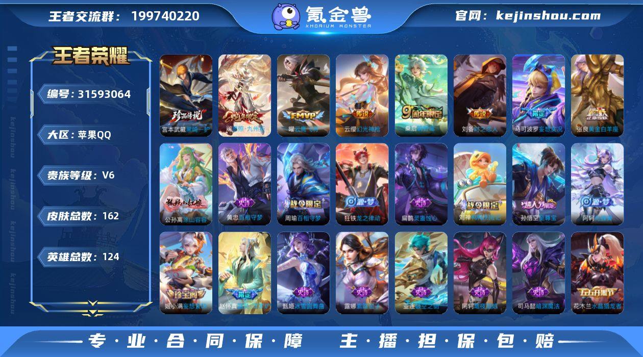 王者荣耀苹果QQ成品号,V6,162款皮肤+124英雄,含宫本黑崎一护、孙悟空至尊宝、澜蛇年限等8款传说皮!收藏家32级,5个王者印记,2市标5区标,主玩阿轲(有6元皮+节奏热浪等)。账号自用充过,安全可二次实名,正常登录无异常。图里全是实机截图,细节真实!价格已开自动调价好价速来,售出不退,诚心要的直接拍!