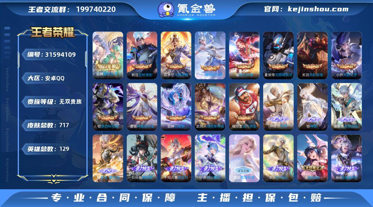 安卓Q-V11-最强王者段位-129英雄-717皮肤-12典藏皮肤-1典藏英雄-1珍品无双-12无双-9珍品传说-119传说-250史诗 【英雄全皮】:廉颇全皮,赵云全皮,墨子全皮,妲己全皮,刘禅全皮,高渐离全皮,阿轲全皮,钟无艳全皮,扁鹊全皮,白起全皮,元歌全皮,甄姬全皮,典韦全皮,宫本武藏全皮,马可波罗全皮,达摩全皮,司马懿全皮,老夫子全皮,露娜全皮,姜子牙全皮,刘邦全皮,韩信全皮,孙权全皮,兰陵王全皮,不知火舞全皮,娜可露露全皮,橘右京全皮,牛魔全皮,后羿全皮,刘备全皮,张飞全皮,虞姬全皮,杨玉环全皮,苍全皮,杨戬全皮,女娲全皮,哪吒全皮,鬼谷子全皮,大乔全皮,黄忠全皮,苏烈全皮,百里玄策全皮,百里守约全皮,梦奇全皮,沈梦溪全皮,狂铁全皮,米莱狄全皮,瑶全皮,云中君全皮,盾山全皮,孙策全皮,猪八戒全皮,亚连全皮,嫦娥全皮,大司命全皮,海月全皮,曜全皮,西施全皮,蒙犽全皮,鲁班大师全皮,蒙恬全皮,阿古朵全皮,桑启全皮,司空震全皮,金蝉全皮,暃全皮,赵怀真全皮,莱西奥全皮,戈娅全皮,空空儿全皮,影全皮,海诺全皮,少司缘全皮 【荣耀典藏】:武则天英雄,武则天倪克斯神谕,夏侯惇无限飓风号,小乔天鹅之梦,程咬金活力突击,花木兰九霄神辉,关羽赤影疾锋,铠银白咏叹调,貂蝉幻阙歌,韩信弑枪猎影,虞姬神鉴启示录,瑶拾光映像,伽罗最初的交响 【珍品无双】:貂蝉馥梦繁花 【无双皮肤】:妲己青丘九尾,瑶真我赫兹,李白碎月剑心,小乔时之魔女,韩信群星魔术团,不知火舞花合斗,公孙离离恨烟,甄姬雪境奇遇,曜器灵螭龙剑,诸葛亮天机白泽,铠神罪,孙悟空无相 【珍品传说】:马可波罗怪盗基德,鲁班七号江户川柯南,孙策时之奇旅,嫦娥器灵落星盏,张飞兔狲蓬尾,瑶大耳狗之梦,安琪拉酷洛米之心,暃朽木白哉,宫本武藏黑崎一护 【传说皮肤】:王昭君长夜焕生,...