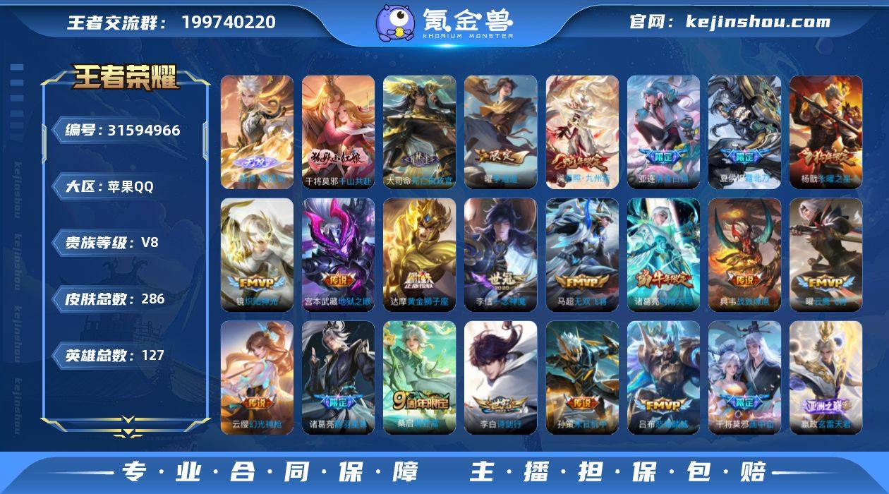 苹果Q-V8-最强王者段位-127英雄-286皮肤-1无双-30传说-80史诗【英雄全皮】:鬼谷子全皮,亚连全皮,蒙恬全皮,影全皮【无双皮肤】:曜器灵螭龙剑【传说皮肤】:干将莫邪千山共赴,大司命死亡执政官,澜愿照九州拓,云缨幻光神枪,嬴政玄雷天君,桑启鸣野蒿,夏侯惇霜北刀,亚连落雪白狼,典韦战鼓燎原,东皇太一灼幽烈阳,诸葛亮鹤羽星尊,干将莫邪画中仙,吕布怒海麟威,李白诗剑行,百里守约碎云,马超无双飞将,孙策末日机甲,曜李逍遥 ,诸葛亮时雨天司,铠绛天战甲,镜炽阳神光,虞姬启明星使,曜云鹰飞将,李信一念神魔,貂蝉猫影幻舞,张良黄金白羊座,达摩黄金狮子座,杨戬永曜之星,宫本武藏地狱之眼,狄仁杰超时空战士【限定皮肤】:夏侯惇霜北刀,姜子牙天穹之誓,李白谪仙醉月,狄仁杰阴阳师,赵云皇家上将,赵云引擎之心,孙尚香蔷薇恋人,高渐离玩趣恶龙,钟无艳超时空战士,吕布御风骁将,元歌云间偶戏,元歌无心,甄姬落雪兰心,马可波罗逐梦之星,狄仁杰魔术师,狄仁杰万华元夜,达摩沙漠行僧,项羽海滩派对,老夫子醍醐杖,程咬金演武夺筹,韩信飞衡,韩信傲雪梅枪,兰陵王金庭之子,孙悟空至尊宝,后羿辉光之辰,李元芳银河之约,李元芳云中旅人,虞姬启明星使,钟馗驱傩正仪,杨戬永曜之星,干将莫邪画中仙,鬼谷子原初探秘者,鬼谷子五谷丰年,诸葛亮时雨天司,诸葛亮鹤羽星尊,铠青龙志,苏烈千军破阵,百里玄策原初追逐者,沈梦溪大漠名商,裴擒虎擒涛扼浪,云中君纤云弄巧,上官婉儿梁祝,嫦娥拒霜思,曜李逍遥 ,鲁班大师探海日志,桑启海盐诗旅,阿古朵江河有灵,张良古海寻踪,蒙犽百解令,蒙恬荣光圣徽,高渐离燃音魔法,妲己灵卜魔法,鬼谷子天穹祈灯,亚连落雪白狼,沈梦溪龙舞盛年,刘邦剑破天穹,海诺心动手记,周瑜熔金海岸【年限皮肤】:铠青龙志,杨戬永曜之星,后羿辉光之辰...
