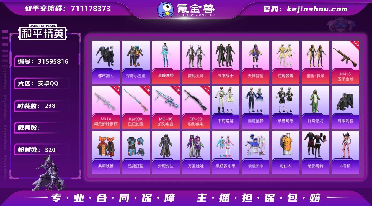 安卓 手Q-6粉装-5特效枪-0载具-1粉色飞行器-98015热力值-18王牌印记-238套装-320枪皮 【热门品类】:套装-浪漫天命,套装-都市猎人,套装-深海小丑鱼,套装-龟仙人,套装-暗影哥特,角色-8号机,角色-Mark.06 【粉色套装】:粉装-数码大师,粉装-未来战士,粉装-天禅智恒,粉装-庄周梦蝶,套装-创世·救赎,角色-异瞳寒姬 【粉色枪皮等级】:M416-五爪金龙(七级),Kar98K-巳巳如意(五级),Mk14-精灵梦叶罗丽(七级),DP-28-豹影疾电(三级),MG-36-幻彩电音(五级) 【粉色枪皮】:M416-五爪金龙,Kar98K-巳巳如意,Mk14-精灵梦叶罗丽,DP-28-豹影疾电,MG-36-幻彩电音 【粉色飞行器】:炫彩糖果飞行器 【粉色降落伞】:甜心宝贝降落伞,四圣焕新降落伞,激战未来降落伞,香水柠檬降落伞,星之彼岸降落伞,暗夜玫瑰降落伞,碧影闪光降落伞,筑梦精灵降落伞,星夜魔法师降落伞,暖熊萌萌降落伞,彩虹甜喵降落伞,旋转彩虹降落伞,飒粉甜心降落伞,创世·救赎降落伞,忍者神龟降落伞,拳皇·狂花道降落伞,冷漠罗丽降落伞,极意拳锋降落伞,炫彩糖果降落伞 【稀有套装】:套装-龟仙人,套装-巳巳如意,套装-云鹰凌岚,套装-雪国风尚,套装-炫彩糖果,套装-雏菊兔兔,套装-萝兰蝴蝶,角色-狂花道·雅典娜,套装-糖糖葫芦,套装-青团波波,角色-海琴烟,套装-云朵鹅,套装-雪绒豹,角色-乐音,套装-书海巡游,套装-画境星梦,套装-琴音绮想,角色-月烬之祷 【稀有枪皮】:AUG-冰晶雪宝,AKM-2P战斗服款,AKM-夜灯,AKM-奇异狩猎者,AKM-彩虹符号,AKM-影袭,AKM-破晓战魂,AKM-缤纷海域,AKM-萌趣颜团子,AKM-虎虎生威,AKM-锦绣火鲤,AKM-霓虹街区,AKM-龙的传人,M16A4-凝视深渊,M16A4-幻世战舞者,M16A4-甜心亚梦,M16A4-千金淑猫,SCAR-L-夜灯,SCAR-L-炫彩节奏,SCAR-L-玉兔迎春,SCAR-L-红色方程式,SCAR-L-青丘仙客,M...