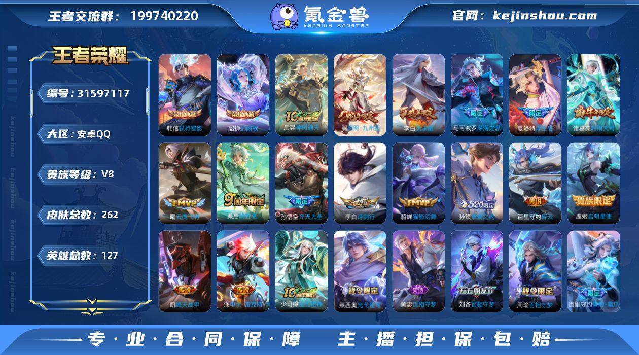 【701】【特价出售】安卓Q-V8-县标鬼谷子-1天幕财神纳福-20按键-127英雄-262皮肤-2典藏-16传说-65史诗(幻阙歌 弑枪猎影 凤求凰) 【英雄全皮】:孙权全皮 【荣耀典藏】:貂蝉幻阙歌,韩信弑枪猎影 【传说皮肤】:后羿神树通天,澜愿照九州拓,桑启鸣野蒿,澜电玩雷克斯,夏洛特浮生妄,孙悟空齐天大圣,李白诗剑行,百里守约碎云,马可波罗深海之息,孙策挚爱之约,诸葛亮时雨天司,铠绛天战甲,虞姬启明星使,曜云鹰飞将,貂蝉猫影幻舞,李白凤求凰 【限定皮肤】:姜子牙天穹之誓,狄仁杰阴阳师,赵云皇家上将,墨子神迹守卫,扁鹊奇幻香踪,芈月重明,芈月幻夜卜梦,元歌无心,马可波罗深海之息,马可波罗山海玄木吟,狄仁杰魔术师,狄仁杰万华元夜,项羽海滩派对,王昭君凤凰于飞,王昭君午后时光,亚瑟潮玩骑士王,孙悟空孙行者,孙悟空齐天大圣,牛魔御旌,后羿圣弓游侠,刘备百相守梦,李元芳云中旅人,虞姬启明星使,杨戬潮玩骑兵,鬼谷子原初探秘者,鬼谷子五谷丰年,诸葛亮时雨天司,弈星混沌棋,沈梦溪大漠名商,裴擒虎李小龙,裴擒虎擒涛扼浪,狂铁御狮,米莱狄御霄,云中君纤云弄巧,盾山御銮,孙策挚爱之约,嫦娥暖冬兔眠,西施玲珑珍味,鲁班大师探海日志,桑启海盐诗旅,夏洛特浮生妄,暃星界游侠,张良古海寻踪,鬼谷子天穹祈灯,姬小满妄想食味,沈梦溪龙舞盛年,刘邦剑破天穹,程咬金群星魔术团,镜青焰无极,项羽苍威无极,周瑜熔金海岸 【年限皮肤】:王昭君凤凰于飞,李白凤求凰,诸葛亮时雨天司,马可波罗山海玄木吟 【赛季限定】:芈月重明,狄仁杰万华元夜,张良古海寻踪,牛魔御旌,李元芳云中旅人,鬼谷子原初探秘者,弈星混沌棋,沈梦溪大漠名商,裴擒虎擒涛扼浪,狂铁御狮,米莱狄御霄,盾山御銮,鲁班大师探海日志,桑启海盐诗旅,鬼谷子天穹祈灯,刘邦剑破天穹,姜子牙天穹之誓 【...