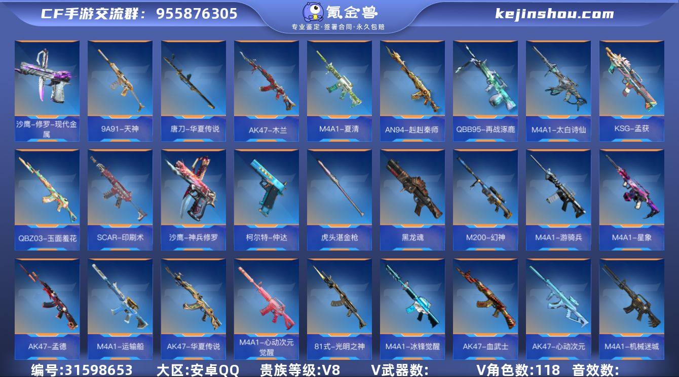 V8/28王者385英雄/王者之腾+冰皮/王者之影/王者之尊/王者之誉/王者之神+冰皮/王者之狱/王者之霆/王者之魂+白金血钻/王者之隐*2+冰皮/王者之锋/王兽手雷套装*3/王翼闪光烟雾+拉丝皮/王心闪光烟雾/王势闪光/雷霆王者闪光/AK孟德/AK奉先+无双/M4星象/M4七色宝葫/M4游骑兵+寒霜/TAC慈/AWM游骑兵/M200幻神/CZS2仲康/VEPR12本初/雷霆cop*3/堕天神cop/黑铁cop+冰川守护/7屠龙/穷奇铁扇/炽芒蝶刃/墨刃幻神/角色/蔡文昭/蝉/消灭音效/炎龙铠甲/焰火贺岁*2/能量核心/8bit/诸神黄昏*2/赏金猎人/狙击枪线/黑化/HeartShot*2/诸神黄昏*3/