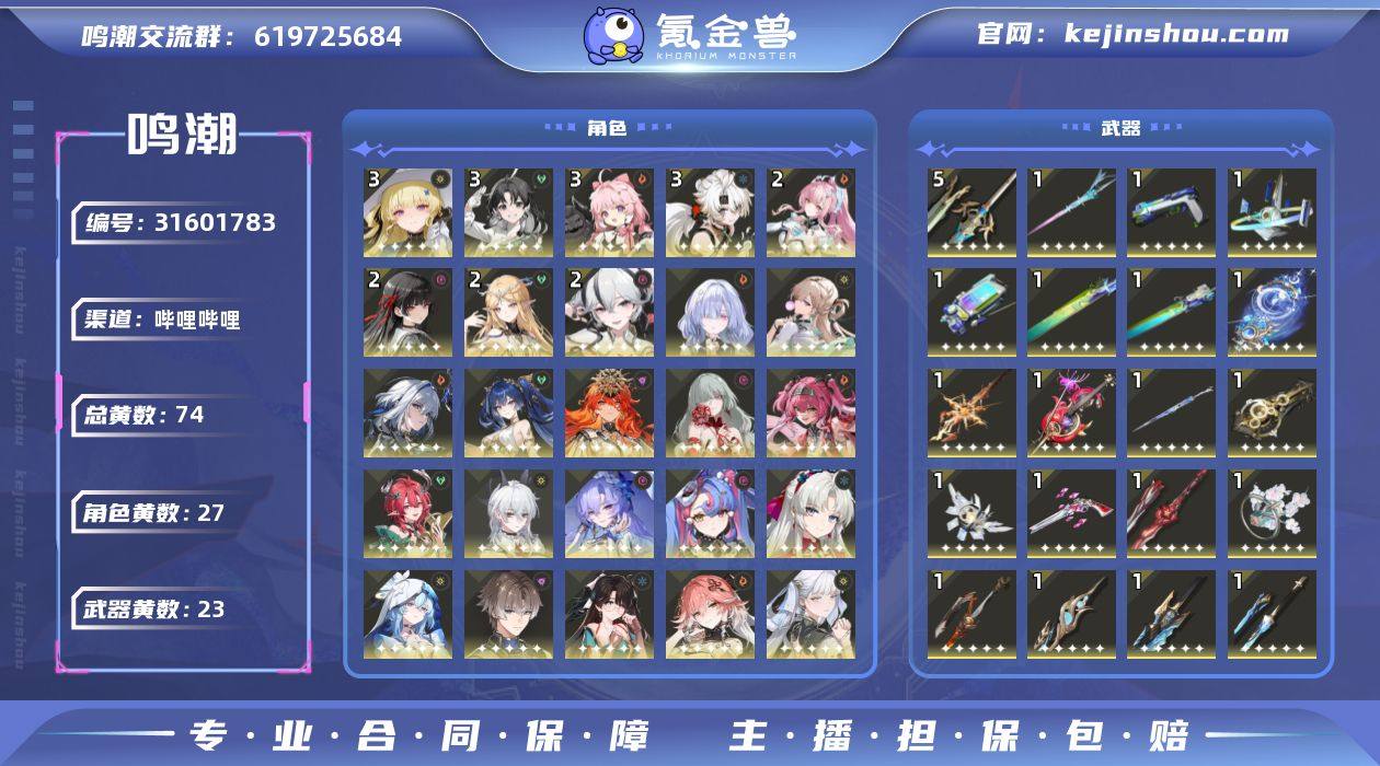 开服全女图鉴号,小欧,2+1爱弥斯/卡提/千咲/椿,3+1菲比,其他主c基本都有专武且大毕业,小程序评分190~200+,皮肤除了赞妮的都有,新旧共10把常驻五星武器已抽齐,3.1新主线未过,还有1700月相和一个月小月卡,648双倍还在,往期所有深渊包括矩阵叠兵奖励都是拿满的,全息也是全满