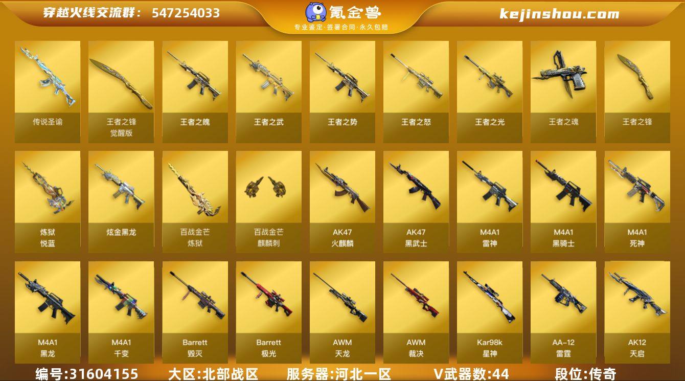 【ky5379】河北一区-48V-13王者武器数-2炫金武器数 【传说武器】:传说圣谕 【传说角色】:传说星骇 【热门武器】:传说圣谕,Kar98K-星神,M4A1-黑骑士,汤姆逊-烈龙*2,RPK-盘龙*3,沙鹰-修罗*5 【王者炫金武器】:王者之势,王者之武,王者之魄,王者之光,王者之怒*2,炼狱-悦蓝*2,王者之魂,王者之锋*2,炫金黑龙*2 【音效卡】:M4A1-雷神音效卡,炼狱-百战金芒-庆典舞曲音效卡 【皮肤】:星神-璀璨皮肤,烈龙-星空,雷神-能量核心*2,雷神-虎将,M4A1-再燃火线,火麒麟-华夏之心,毁灭-暗月,毁灭-荣耀之怒,毁灭-星空,黑龙-能量核心,黑龙-暗月*2,M4A1-黑龙-361,黑骑士-暗月,无影-暗月*5,无影-能量核心,死神-秘银*2,AK47-黑武士-361,天启-暗月,天龙-秘银*2,天龙-能量核心,修罗-能量核心*2,修罗-星空,天神-暗月*4,屠龙-荣耀之锋,轻型军用手斧-再燃火线 【角色】:葵,灵狐者-X,灵狐者-黄金海岸,龙儿,潘多拉-X,潜龙队-X,铁骑荣耀,雪莉杨 【英雄级武器】:M4A1-千变,AK47-火麒麟,M4A1-黑龙,M4A1-雷神,M4A1-黑骑士,M4A1-死神,AK47-黑武士,AK12-天启*4,AWM-天龙,Barrett-毁灭*2,Barrett-极光,AWM-裁决,Kar98K-星神,RPK-盘龙*3,炼狱-百战金芒,汤姆逊-烈龙*2,AA-12-雷霆,沙鹰-修罗*5,沙鹰-天神*2,屠龙*2,龙啸,擎天*2,麒麟刺,麒麟刺-百战金芒,王者之锋-觉醒版,丛林匕首-玄豹,王者冰锋-觉醒版,高爆手雷-玄豹 【道具】:战舰背包,炫彩背包,百战金芒炫彩背包,超级背包,女皇终结者-魔龙之吻,绿色巨人,灵魂忍者,变异宝贝,迷雾幽灵,夺命之镰,防化服*3,语音特效-盛典烟火,萌萌小葵表情,防弹头盔*3,防弹衣*3,C4工具钳*3,手雷包*3 【特殊枪械】:1黑骑士,2烈龙,3盘龙