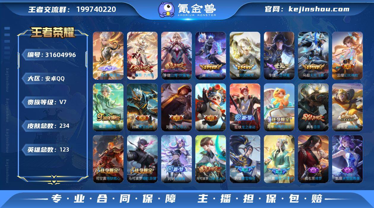【234皮1无双11传说器灵螭龙剑 无双飞将 一念神魔 逐花归海 愿照九州拓】:安卓Q-V7-至尊星耀V段位-123英雄-234皮肤-0典藏-0珍品无双-1无双-0珍品传说-11传说-63史诗 【无双皮肤】:曜器灵螭龙剑 【内测皮肤】:孙尚香蔷薇恋人,狂铁特工战影 【传说皮肤】:梦奇胖达荣荣,刘备时之恋人,李信一念神魔,镜炽阳神光,孙策末日机甲,马超无双飞将,李信山海炽霜斩,澜逐花归海,桑启鸣野蒿,云缨幻光神枪,澜愿照九州拓 【限定皮肤】:姜子牙天穹之誓,李白谪仙醉月,狄仁杰阴阳师,赵云皇家上将,孙尚香蔷薇恋人,钟无艳王者之锤,钟无艳超时空战士,甄姬落雪兰心,典韦岱宗,马可波罗暗影游猎,马可波罗山海玄木吟,狄仁杰魔术师,项羽海滩派对,韩信傲雪梅枪,王昭君午后时光,兰陵王金庭之子,孙悟空美猴王,孙悟空孙行者,李元芳云中旅人,鬼谷子五谷丰年,百里玄策原初追逐者,沈梦溪大漠名商,裴擒虎擒涛扼浪,狂铁电玩高手,李信山海炽霜斩,上官婉儿梁祝,嫦娥暖冬兔眠,西施玲珑珍味,蒙犽狂想玩偶喵,鲁班大师探海日志,桑启海盐诗旅,暃星界游侠,戈娅驭风魔法,艾琳流音漫舞,司空震地狱燃心,阿古朵江河有灵,张良古海寻踪,蒙恬荣光圣徽,高渐离燃音魔法,妲己灵卜魔法,鬼谷子天穹祈灯,百里玄策超元猎域,沈梦溪龙舞盛年,刘邦剑破天穹,程咬金群星魔术团,刘备异域游侠,周瑜熔金海岸 【年限皮肤】:孙悟空美猴王,典韦岱宗,马可波罗山海玄木吟,李信山海炽霜斩 【赛季限定】:兰陵王金庭之子,张良古海寻踪,李元芳云中旅人,百里玄策原初追逐者,沈梦溪大漠名商,裴擒虎擒涛扼浪,鲁班大师探海日志,桑启海盐诗旅,鬼谷子天穹祈灯,蒙恬荣光圣徽,刘邦剑破天穹,姜子牙天穹之誓 【战令限定】:钟无艳超时空战士,甄姬落雪兰心,马可波罗暗影游猎,王昭君午后时光,艾琳流音漫舞,狂铁电玩高手...