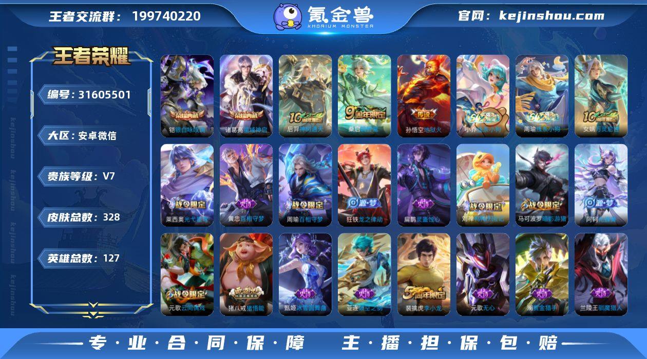 贵族等级:V7 典藏皮肤数:2 珍品无双皮肤数:0 无双皮肤数:0 珍品传说皮肤数:0 传说皮肤数:3 史诗皮肤数:72 皮肤数:328 英雄数:127 段位:星耀