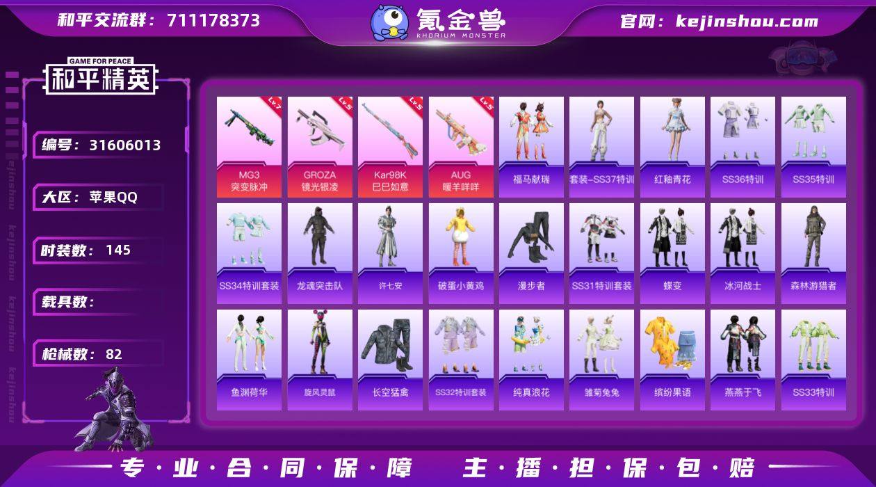 实名:可二次实名 是否支持人脸包赔:支持 特效枪数量:4 时装数:145 枪械数:82 七级MG3-突变脉冲,五级AUG-暖羊咩咩,五级GROZA-镜光银凌,五级Kar98K-巳巳如意 福马献瑞,红釉青花,SS37特训,雨过天青,SS36特训,SS35特训,SS34特训套装,冰冻风暴,缤纷果语,冰河战士,雏菊兔兔,长空猛禽,纯真浪花,蝶变,疯狂小兔子,龙魂突击队,萝兰蝴蝶,恋语绒绒,Mark.06,漫步者,破蛋小黄鸡,青团波波,热情海星,森林游猎者,SS31特训套装,SS32特训套装,SS33特训套装,糖糖葫芦,旋风灵鼠,许七安,旭日情侣,鹰眼刺客,鱼渊荷华,燕燕于飞,智谋强哥 临安公主降落伞 卖家说:这个赛季小金鞋必得,号里面还有一千多点卷
