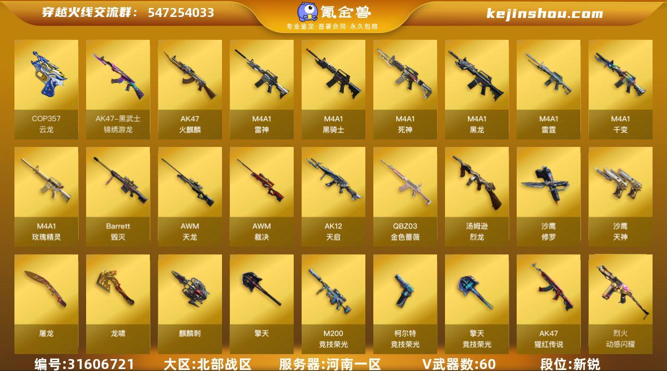 【ky5475】河南一区-67V-7王者武器数-0炫金武器数 【热门武器】:QBZ03-金色蔷薇,M200-竞技荣光,死亡之眼,M4A1-黑骑士,汤姆逊-烈龙*5,斯泰尔-蝴蝶,MK5-炽火炎龙,USP-雷暴,沙鹰-修罗*2 【音效卡】:AK47-火麒麟音效卡,M4A1-雷神音效卡,M4A1-黑骑士音效卡,Barrett-毁灭音效卡 【皮肤】:雷神-暗月,雷神-星空,雷神-耀金皮肤,雷神-机甲刑天皮肤,雷神-宇航兔皮肤,雷神-源计划2.0专属 皮肤,火麒麟-AG战队皮肤,火麒麟-百城*2,毁灭-星空,毁灭-风暴,毁灭-百城浙江 皮肤,黑龙-墨子皮肤,黑骑士耀金皮肤,修罗-CF STAR 【角色】:零,炫,电竞教官-云悠悠,乔伊教练,修道士,暗夜-X,电竞少女,芳心审判者,飞虎队-X,风暴女,虎妞,嘉年华灵狐,娟娟,兰-新年限定,0号玩家,灵狐者-X,灵狐者-七夕宝贝,龙儿-小淘气,麻雀,曼陀罗-X,潘多拉-X,潘多拉-甜心教官,青霞仙子,蜀雪,兔囡囡,维纳斯,雪莉杨,雪莉杨-摸金校尉,夜玫瑰-宠粉,樱-战斗天使,影武者-X 【人偶武器】:星神-炽天使,MK5-炽火炎龙,斯泰尔-蝴蝶,AWM-灵狐-15周年嘉年华,迷你深渊冰龙*2,迷你裂空之翼,迷你波特博士,夺魂,迷你牛牛,迷你生化手雷,深渊终结者手雷*2,迷你艾比 【暴走生化】:死亡之眼,超级对讲机 【挑战大师】:激光毁灭者III-白马银枪,激光毁灭者III 【英雄级武器】:M4A1-千变,AK47-火麒麟,M4A1-黑龙,M4A1-雷神*2,M4A1-黑骑士,M4A1-死神,AK12-天启,M4A1-雷霆,黑武士-锦绣游龙,M4A1-玫瑰精灵,QBZ03-金色蔷薇,烈火-动感闪耀,AK-47-猩红传说*2,AWM-天龙,Barrett-毁灭,AWM-裁决,M200-竞技荣光,汤姆逊-烈龙*5,沙鹰-修罗*2,沙鹰-天神*2,USP-雷暴,COP-雷霆,柯尔特-竞技荣光,COP 357-云龙*2,天神-动感闪耀,屠龙*2,龙啸*2,擎天,麒麟刺,擎天-竞技荣光,屠龙-动感闪耀,高爆手雷-雷...