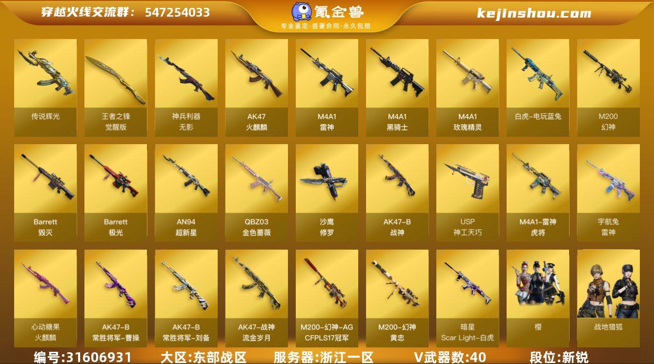 【ky5499】浙江一区-47V-2王者武器数-0炫金武器数 【传说武器】:传说辉光 【热门武器】:传说辉光,QBZ03-金色蔷薇,M4A1-青龙,M200-幻神,白虎-电玩蓝兔,M4A1-黑骑士,金色蔷薇-空,沙鹰-修罗*5 【王者炫金武器】:王者之魄高爆手雷 【音效卡】:M200-幻神音效卡 【皮肤】:M200-幻神-黄忠皮肤,幻神-AG-CFPLS17冠军,幻神-KZ-CFPLS25冠军 皮肤,Scar Light-白虎-暗星,金色蔷薇-电竞之星 皮肤,雷神-荣耀之魄,雷神-虎将,雷神-宇航兔皮肤,火麒麟-心动糖果,战神-流金岁月皮肤,AK47-B-常胜将军-曹操*2,AK47-B-常胜将军-刘备,极光-能量核心 【角色】:樱,战地猎狐,暗夜-X,初恋灵狐,芳心审判者,风暴女,虎妞,娟娟,潘多拉-X,蛇姬,斯沃特-X,兔囡囡 【人偶武器】:金色蔷薇-空,夺魂,生化手雷-机甲核心,迷你超能女侍 【暴走生化】:超级对讲机 【英雄级武器】:AK47-火麒麟,M4A1-雷神*2,M4A1-黑骑士,AN94-超新星,M4A1-青龙,QBZ03-天罚,无影-神兵利器,M4A1-玫瑰精灵,QBZ03-金色蔷薇,AK47-B-战神,白虎-电玩蓝兔,Barrett-毁灭,Barrett-极光,M200-幻神,沙鹰-修罗*5,USP-神工天巧,王者之锋-觉醒版,高爆手雷-雷暴,高爆手雷-竞技荣光,高爆手雷-神工天巧*2,闪光弹-雷霆*2,闪光弹-竞技荣光,闪光弹-神工天巧*3,烟雾弹-神工天巧*4 【道具】:BS战队炫彩背包,亚洲杯纪念炫彩背包,战舰背包,炫彩背包,女皇终结者-魔龙之吻,救世主-黑桃战神,绿色巨人,灵魂忍者,迷雾幽灵,夺命之镰*2,防化服*3,金色流光-枪王排位,流光-鎏金之域,流光-再燃火线,枪王排位29赛季金色流光,电玩兔兔表情,防弹头盔*4,防弹衣*4,C4工具钳*3,手雷包*3 【特殊枪械】:1黑骑士