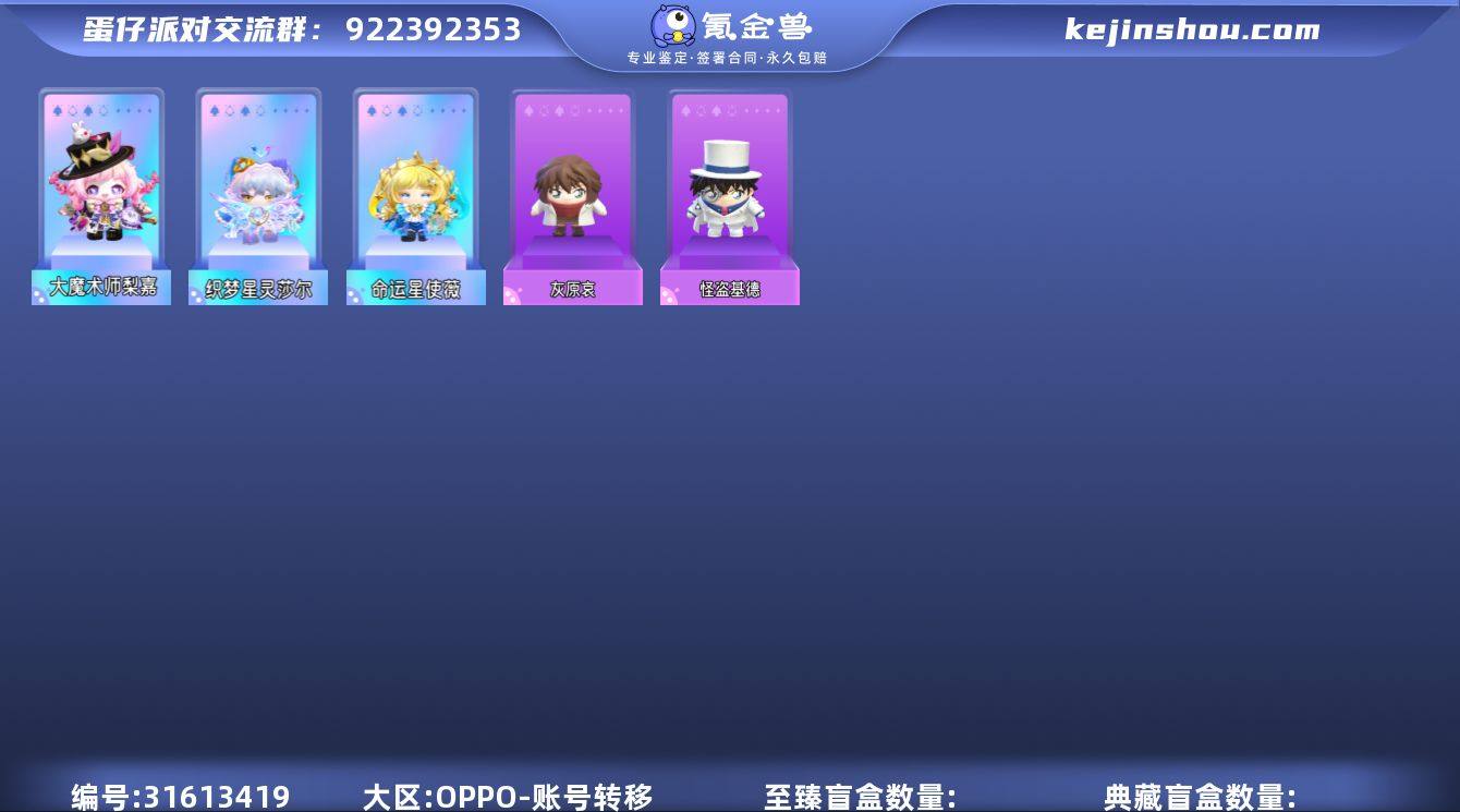 大魔术师梨嘉,命运星使薇,织梦星灵莎尔 怪盗基德,灰原哀 段位:巅峰凤凰蛋 卖家说:是一个玩家从第5个赛季开始玩的差不多皮肤都有氪金条拉满