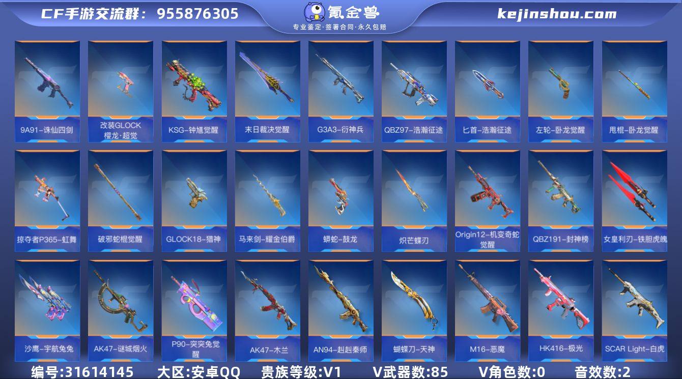 87级,VIP1级,王尊,狙击枪线1消灭音效1;【王者武器】:王者之尊;【三国武器】:左轮-卧龙觉醒;【热门武器】:AK47-血武士,AK47-燎天净火,M4A1-海骑士,AK47-木兰,M4A1-雷神,M4A1-运输船,AK47-谜城烟火,AK47-火麒麟,SCAR-探星者,SCAR-心动PICK,M14EBR-暗夜,M14EBR-拂影,9A91-诛仙四剑,SCARLight-白虎,AN94-赳赳秦师,QBZ95-天使,QBZ03-金色蔷薇,AK12-天启,G36-李星云,M16-恶魔,QBZ03-玉面羞花,HK416-极光,G3A3-衍神兵,AWM-天龙,AWM-裁决,QBZ191-封神榜,Ash-马上来财,巴雷特-毁灭,Ash-马上来财(赛季强化),QBZ97-浩瀚征途,QBZ97-智控天眼,98K-黑骑士,98K-血月,09式狙-魔音长歌觉醒,M200-幻神,加特林-堡垒,MG36-黑骑士,MR1-龙吟惊沧海,98K-星神,P90-突突兔觉醒,地狱火,双持斯泰尔-天使,汤姆逊-烈龙,USP-机械迷城,KSG-钟馗觉醒,KSG-黑骑士,沙鹰-神兵修罗,沙鹰-明目达聪