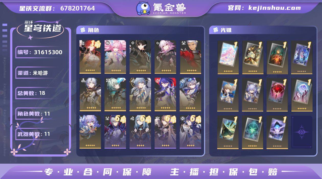 总黄数:18 五星光锥数:11 五星角色数:11 开拓等级:69 开拓者性别:女 星轨专票:1 梦华数量:0 星琼数量:64 1命姬子,0命昔涟,0命丹恒·腾荒,0命长夜月,0命Archer,0命白厄,0命那刻夏,0命星期日,0命黄泉,0命银狼,0命白露 1精爱如此刻永恒,1精纵然山河万程,1精生命当付之一炬,1精雨一直下,1精制胜的瞬间,1精时节不居,1精不息的演算,1精记忆的质料,1精记一位星神的陨落,1精记忆永不落幕,1精星海巡航 换绑材料:可提供换绑材料 邮箱状态:未绑定 psn绑定情况:否 taptap绑定情况:否