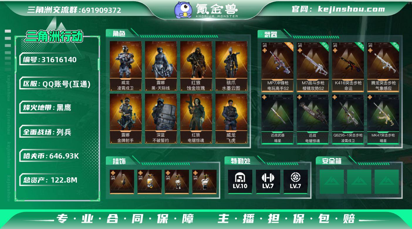 实名:不可二次实名 总资产:122.8M 哈夫币:646.93K 烽火地带段位:黑鹰 烽火地带等级:60 全面战场段位:列兵 全面战场等级:14 10级仓库,7级训练中心,7级靶场,6级指挥中心,3级潜水中心,3级防具台,3级工作台,3级制药台,3级技术中心,1级收藏室 战术部门等级:4 战斗部门等级:4 医疗部门等级:4 研发部门等级:4 后勤部门等级:4 曼德尔砖-气象感应:0 曼德尔砖-命运王牌:0 曼德尔砖-电玩高手:0 曼德尔砖-美杜莎:0