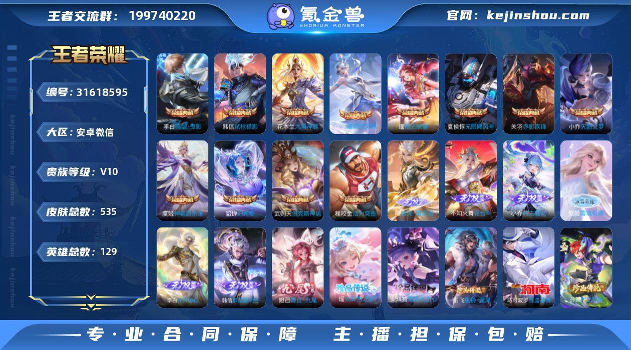 贵族等级:V10 典藏皮肤数:12 珍品无双皮肤数:0 无双皮肤数:7 珍品传说皮肤数:7 传说皮肤数:100 史诗皮肤数:171 皮肤数:535 英雄数:129 段位:王者