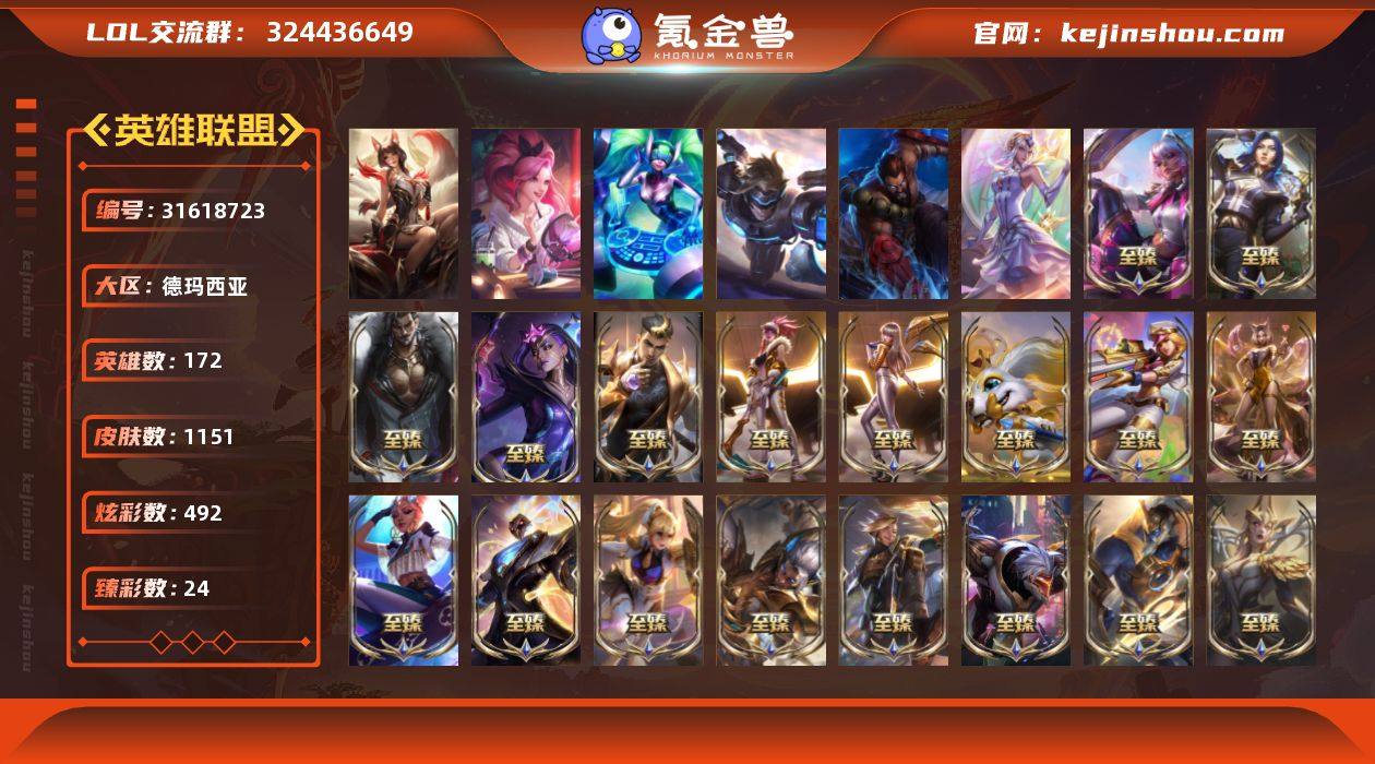 实名: 可修改 英雄数: 172 皮肤数: 1151 炫彩数: 492 至臻: 至臻 未来战士 锤石,至臻 K/DA 阿狸,至臻 电玩女神 凯特琳,至臻 绒毛菲兹,至臻 K/DA 卡莎,至臻 真实伤害 奇亚娜,至臻 K/DA 阿卡丽,至臻 飞升战神 潘森,至臻 魔女 乐芙兰,至臻 源计划:阴 劫,至臻 战斗学院 蕾欧娜,至臻 灵能特工 伊泽瑞尔,至臻 神龙尊者 炎龙瑟提,至臻 黑夜使者 凯隐,至臻 神龙尊者均衡之龙 沃利贝尔,至臻 焰执事 布兰德,至臻 神凰行者 烈羽焰凰 霞,至臻 幻灵战斗猫 金克丝,至臻 西部魔影 泰隆,至臻 星之守护者 艾克,至臻 星之守护者 辛德拉,至臻 灵魂莲华 易,至臻 至高天 奎桑提,至臻 剪纸仙灵 希维尔,至臻 青花瓷 丽桑卓,至臻 星之守护者 索拉卡,至臻 花仙使者 卡特琳娜,至臻 墨之影武者 亚索,至臻 斗魂觉醒 萨科,水晶圣骑 塔莉垭,至臻 神龙尊者 比翼之龙 洛,至臻 DRX 亚托克斯,水晶掠夺者 卡兹克,殿堂传奇 乐芙兰,至臻 T1 杰斯,至臻 暗星女王 黛安娜,至臻 狼神英灵 斯维因,至臻 双城之战2 指挥官 凯特琳,至臻 战斗学院 奇亚娜 海克斯: 海克斯 安妮,海克斯 雷克顿,海克斯 阿木木,海克斯 斯维因,海克斯 吉格斯,海克斯 魔腾 限定: 2021 全球总决赛 嘉文四世,双城之战2 指挥官 凯特琳,双城之战2 救世主 维克托,双城之战2 范德尔 沃里克 情人节限定: 觅心猎手 薇恩,觅心萝莉 金克丝,觅心游侠 卢锡安,水晶玫瑰 婕拉,甜心之翎 洛,甜心之羽 霞 赛季限定皮: 胜利枪神 格雷福斯,胜利女神 奥莉安娜,胜利之剑 亚托克斯,胜利枪神 卢锡安,胜利机器人 布里茨,胜利女神 瑟庄妮,胜利凤凰 艾尼维亚,胜利巨口 克格莫 冠军限定系列: S1FNC 酒桶,S1FNC 迦娜,S1FNC 嘉文四世,S1FNC 卡尔萨斯,S1FNC 库奇,S2 暗杀星 蒙多,S2 暗杀星 努努,S2 暗杀星 慎,S3 SKT T1 劫,S3 SKT T1 贾克斯,S3 SKT T1 李青,S3 SKT T1 婕拉,S4 SSW 锤石,S4 SSW 雷恩加尔,S4 SSW 泰隆,S...