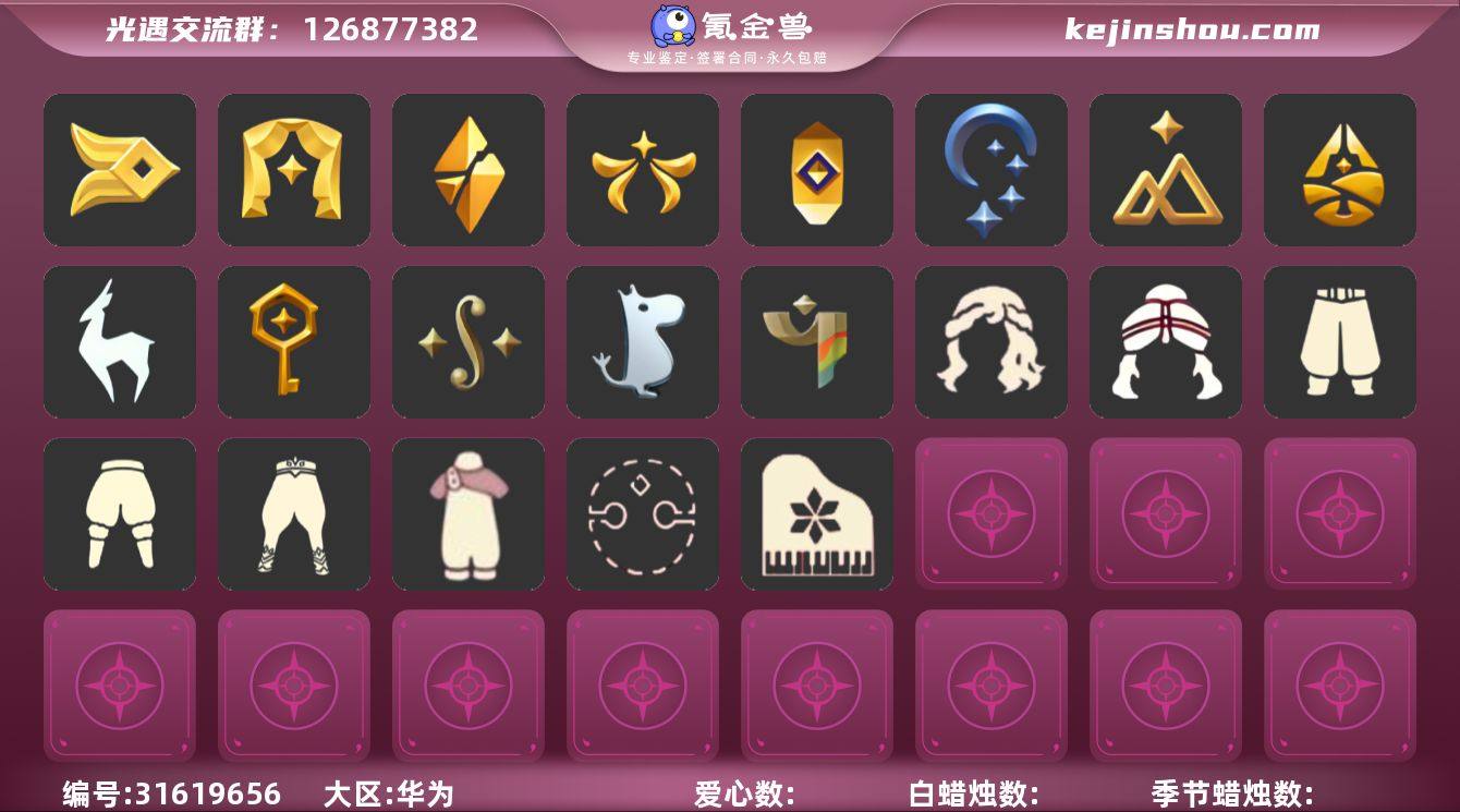 [17220538]安卓官服 邮箱账号 3珍稀物品 13毕业季 6毕业图 804蜡烛 【珍稀物品】白枭(帝企鹅发),透明蝶翼斗,彩虹围巾(五塑彩带斗) 【季节已毕业】青鸟季,潜海季,表演季,欧若拉季(欧若拉),追忆季,夜行季,拾光季,归巢季,九色鹿(九色鹿季),筑巢季,二重奏季,姆明季,彩染季 【完成地图】晨岛,云野,雨林,霞谷,墓土(暮土),禁阁 【礼包】青衫落拓礼包,兔子鞋(兔子拖鞋),运动鞋(跃动跑鞋),新年裤(瑞气服饰),暗彩装扮(彩虹武士裤),姆明饰品套装(姆明尾巴),南瓜(冥龙南瓜),巫师(巫师帽),橘子(大橘大利),奥利奥(周年庆抱枕),雪花(雪花发夹),兔子(玉兔头饰)(玉兔发饰)(兔子发饰),心心相印发饰礼包,四叶草(四叶草头饰),九色鹿角(神鹿祝福头饰)(神鹿祝福礼包),彩虹耳钉(彩虹耳饰),鹿角(圣诞鹿角),创始人(创始人斗篷),围巾(小王子斗篷)(小王子围巾),欧若拉之翼,莲花斗(异彩莲花斗篷),福娃(福娃礼包)(春之日礼包)(铜钱斗),透明蛛丝(透明蜘蛛斗),白绒金(白雪斗篷),红伞(瑞气纸伞),秋千(情人秋千),雪花球(雪花水晶球),大耳狗抱枕 【裤子】筑巢季·裤子(设计师长袍),妮妮裙子(妮妮长裙),蓝绿裤(高领舞服),武士裤,背带裤,搓澡巾,击剑裤 【面具】夜行毕业面具(棕熊面具),呼吸面具(潜水面具),黄眉企鹅面具,辉光羚羊面具 【面饰】黑框眼镜(粗框眼镜),青鸟毕业面饰(青鸟面饰),红耳机 【项链】围巾(肩带) 【发型】单侧绑发(单边小辫),飞天盘发(九色鹿丸子头),留辫蘑菇头,虚荣,归巢毕业发型(五塑彩羽发),若笠(箬笠) 【头饰】平顶帽,蓝色音乐会(蓝色音乐符),牛仔帽(西部帽) 【斗篷】燕尾斗篷,领主红斗篷(暗红斗篷),粉红绒毛斗篷(绒毛斗篷),青鸟毕业斗篷(青鸟斗篷),彩染围巾斗篷,绿芽,海洋斗 【配饰】鲲灯(追忆之书),相机(季卡相机),姆明抱枕,雨伞,筑巢季·小手办(光之子试衣),高音钢琴(白色高脚钢琴)