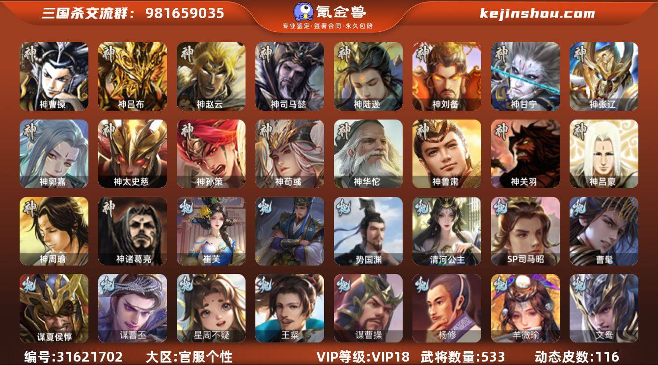 VIP等级: VIP18 官阶: 大将军 武将数量: 533 动态皮肤数量: 116 神将: 神曹操,神甘宁,神郭嘉,神刘备,神陆逊,神吕布,神司马懿,神孙策,神太史慈,神荀彧,神张辽,神赵云,神关羽,神吕蒙,神周瑜,神诸葛亮,神鲁肃,神华佗 魏国武将: 刘晔,戏志才,曹纯,曹婴,陈琳,程昱,郝昭,嵇康,界曹真,界于禁,界钟会,马钧,魏-司马昭,王朗,王凌,王元姬,文鸯,羊徽瑜,杨修,谋曹操,王粲,唐咨-魏,张辽,SP蔡文姬,SP曹仁,SP关羽,SP贾诩,SP姜维,SP庞德,卞夫人,蔡贞姬,曹昂,曹操,曹冲,曹洪,曹丕,曹仁,曹叡,曹嵩,贾逵,王异,张恭,鲁芝,界满宠,曹休,界曹植,满宠,荀攸,王基,钟繇,蒯越蒯良,郭嘉,牵招,荀彧,阮慧,杜畿,界郭嘉,崔琰,界曹丕,蒋济,界荀彧,朱灵,界甄姬,辛毗,吕虔,界王异,界许褚,界郭淮,华歆,陈群,界邓艾,界典韦,界曹休,谋甄姬,袁涣,李通,乐进,辛宪英,郭淮,毛玠,界曹彰,郭皇后,毌丘俭,夏侯惇,曹植,司马朗,谋于禁,界曹操,星周不疑,许褚,界张辽,谋徐晃,张郃,钟会,文聘,曹彰,界夏侯惇,诸葛诞,司马懿,甄姬,杨阜,界徐晃,徐晃,界曹仁,孙资刘放,韩浩史涣,胡班,曹真,谋曹丕,典韦,界夏侯渊,谋荀彧,夏侯渊,李典,于禁,王双,邓艾,界司马懿,张春华,孟达-魏,臧霸,牛金,朱灵(国战),文钦-魏,谋夏侯惇,曹髦,成济,玄·毌丘俭,李昭焦伯,清河公主,SP司马昭,司马伷,董昭,谋郭嘉,谋张辽,王经,谋夏侯渊,势国渊,崔芙 蜀国武将: 董允,关索,花鬘,界黄忠,谯周,沙摩柯,王平,张星彩,赵襄,周群,诸葛瞻,谋马超,谋赵云,谋黄忠,蜀-谋孙尚香,马云騄,谋黄月英,徐庶,界魏延,杨仪,谋刘备,吕凯,界关羽,界诸葛亮,邓芝,界伊籍,胡金定,费祎,严颜,界黄月英,界张嶷,赵云,张松,彭羕,李丰,界刘备,谋法正,界刘禅,刘封,糜竺,李遗,蒋琬,谋庞统,黄月英,刘巴,关羽,王甫赵累,吴懿,吴班,界吴懿,界廖化,向宠,祝融,张飞,黄皓,陈震,魏延,界周仓,谋祝融,马忠,界法正,糜夫人,界孟获,刘禅,界赵云,谋诸葛亮,...