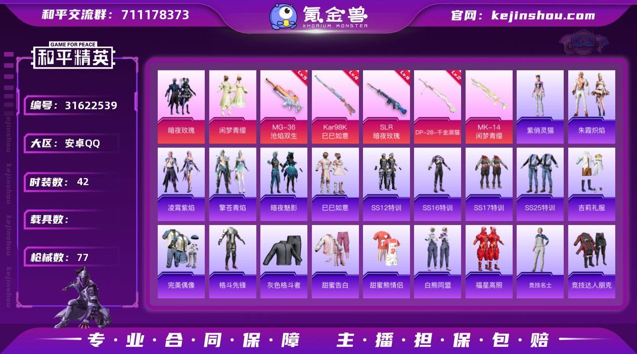 安卓 手Q-2粉装-5特效枪-0载具-2粉色飞行器-25348热力值-1王牌印记-42套装-77枪皮 【粉色套装】:粉装-暗夜玫瑰,粉装-闲梦青缨 【粉色枪皮等级】:Kar98K-巳巳如意(四级),SLR-暗夜玫瑰(四级),DP-28-千金淑猫(二级),MG-36-沧焰双生(五级) 【粉色枪皮】:Kar98K-巳巳如意,Mk14-闲梦青缨,SLR-暗夜玫瑰,DP-28-千金淑猫,MG-36-沧焰双生 【粉色飞行器】:炫彩糖果飞行器,极意拳锋飞行器 【粉色降落伞】:葫芦兄弟降落伞,暗夜玫瑰降落伞,旋转彩虹降落伞,闲梦青缨降落伞,江南烟雨降落伞,千金淑猫降落伞,喜羊羊与灰太狼降落伞 【稀有套装】:套装-巳巳如意,套装-朱霞炽焰,套装-凌霄紫焰,套装-擎苍青焰,角色-紫俏灵猫 【稀有枪皮】:AKM-萌趣颜团子,AKM-虎虎生威,M16A4-幻世战舞者,SCAR-L-暗夜玫瑰,SCAR-L-红色方程式,SCAR-L-龙宫之主,GROZA-2B战斗服款,AUG-闲梦青缨,QBZ-彩虹符号,M762-橘柚倾心,M762-瑞龙福将,M762-镭射皇者,G36C-时空追击者,G36C-暗夜玫瑰,AC-VAL-天降萌叽,AC-VAL-闲梦青缨,ARX-凌霄紫焰,UZI-炫彩节奏,UMP45-时空追击者,Vector-暗夜玫瑰,Vector-生命誓言,野牛-电玩视界,JS9-凌霄紫焰,Kar98K-2B战斗服款,Kar98K-彩虹符号,Kar98K-梦幻火箭,M24-炫彩节奏,SKS-心之恋语,SKS-时空追击者,VSS-镭射皇者,Mini14-耀粉歌者,Win94-瑞龙福将,SLR-四圣焕新,S1897-炫彩节奏,S12K-玩趣呆呆,S12K-瑞龙福将,DBS-时空追击者,AA12-G-萌物绒绒,M249-冷魅冰骑,M249-四圣焕新,DP-28-锦绣火鲤,MG3-瑞龙福将,MG-36-凌霄紫焰,P92-凌霄紫焰,蝎式手枪-闲梦青缨,TMP-9-江南烟雨,战术弩-江南烟雨,平底锅-凌霄紫焰,破片手榴弹-巳巳如意 【其他套装】:套装-SS12特训,套装-SS16特训,套装-SS17特训,套装-SS25特训,套装-吉莉礼服,套装-完美偶像,套装-格斗先锋,...