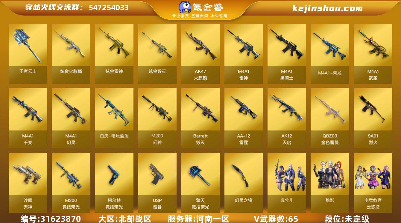 5382/北部/河南一区/可排位/【传奇4】/【Lv.100 大元帅】/VIP2/65V/幻神/王者风神/M200竞技荣光套/【QBZ金色蔷薇三件套】/QBZ金色蔷薇/QBZ音效卡/QBZ巅峰荣耀/青龙/玄武/王者凌虎/白虎电玩蓝兔/幻灵套/COP幻灵/柯尔特竞技荣光/USP雷暴/七套玄豹雷/独角之刃/【音效卡】/雷神音效卡/黑骑士音效卡/黑龙音效卡/火麒麟怀旧音效卡/死神雪域霜狐怀旧音效卡/极光音效卡/【枪皮】/【无白虎】白虎暗星/毁灭雪域霜狐/毁灭战神张飞/黑武士361/雷神神秘按键/雷神诺拉/烈火熔核/【四防角色】/电竞教官云悠悠/鹰/【角色】魅影/岚兮儿/王者凌霄/葵阿尔法装甲/樱缤纷夏日/葵赛博朋克/【小人枪】/COP旗袍/异变清道夫蛇影双骄/【道具】/永久护目镜/超级背包/各种戒指/各种光效/各种玩偶/永久AC/永久雷包/细节看图/【此账号未被封过十年】