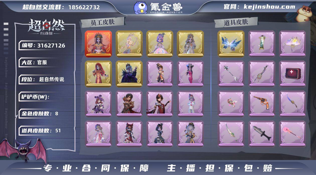 红色皮肤数量:1 金色皮肤数量:8 紫色皮肤数量:26 道具皮肤数量:51 镜生遗梦 莲华渡,遗失的童话,圣光之谕,镜花辞,渡鸦公爵 卖家说:伪全皮