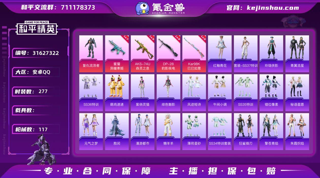 kk2201270-F183 苹果微信-7王牌印记-3粉装-4特效枪-29145热力值-63套装-98枪皮-3卓越印记-2传奇印记-小丑鱼,六号树人-地铁满天赋-电力室,研究所3级 【3粉装】角色-冷漠罗丽,角色-圣堂之誓,套装-镜光幻境 【4特效枪】DP-28-豹影疾电/5级,AMR-智耀战神/6级,Kar98K-巳巳如意/5级,AKM-绿萝繁花/5级 【2稀有紫装】小丑鱼,六号树人 【63稀有时装】冷漠罗丽,SS35特训,SS33特训,SS32特训,彩虹兔,时希公主,雪绒豹,SS34特训,朱霞炽焰,大橘大利,小丑鱼,六号树人,凌霄紫焰,无面战甲,擎苍青焰,炫彩糖果,萌鸡速递,薄荷星砂,云朵鹅,镜光幻境,圣堂之誓,异域银装,狂花道·娜可露露,都市丽猫,街头风暴,光矢逐梦,鱼渊荷华,青团波波,燕燕于飞,战术大师,糖糖葫芦,华灯初上,贝斯之夜,忠义严颜,英勇保护者,虎虎生威吉莉,龙的传人,潮酷猛小鳄,智慧之神,青玉碎影,绯格组合,SS26特训,空岛之星,黑色伏地魔,竞技名士,雨林探路者,忠真马岱,长空猛禽,冷焰舞者,惊鸿侠骨,魅力单车,云霞荷露,春光漫游,极地朋克,快闪甜心,破晓战魂,霓虹街区,光之冒险,晨曦薄雾,柠萌假日,SS25特训,锦衣飞扬,黑夜传说 【98稀有枪械】Vector-创世·救赎,DBS-创世·救赎,Kar98K-巳巳如意/5级,AMR-智耀战神/6级,DP-28-豹影疾电/5级,AKM-绿萝繁花/5级,GROZA-无面战甲,Win94-乌木金纹,蜜獾-乌木金纹,M762-云朵鹅,SVD-云朵鹅,SPAS-12-狂鲨锋刃,MK20-H-狂鲨锋刃,AUG-冰晶雪宝,铝热弹-炫彩糖果,UZI-炫彩糖果,G36C-星穹咏叹调,JS9-凌霄紫焰,MG-36-凌霄紫焰,破片手榴弹-海盐豹豹,UMP45-海盐豹豹,ARX-凌霄紫焰,AKS-74U-乌木金纹,AKM-涂鸦街区,P92-凌霄紫焰,Famas-乌木金纹,Famas-霓彩脉冲,SPAS-12-云朵鹅,M249-无面战甲,破片手榴弹-拽到爆炸,平底锅-无垠阁,平底锅-凌霄紫焰,沙漠之鹰-云