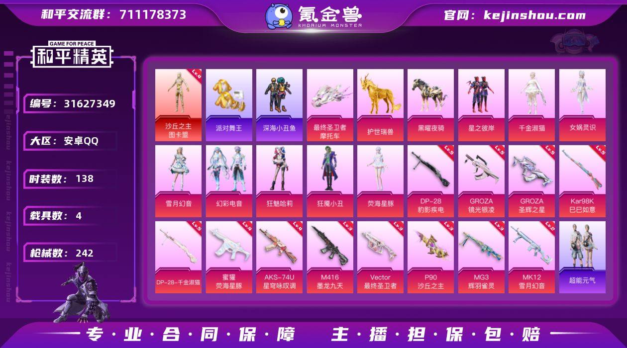 【4级图卡盟 金鞋 5把计数枪 番茄 满地铁天赋】YXc25522-【可二次】【因赛季更新游戏段付以上号为准!】 安卓Q-1红装4稀有4载具8粉装13特效枪8热门138套装242枪皮 7印记 历史超级王牌16星 【1红装】 沙丘之主-图卡盟 (4级) 【4稀有】 AKM-缤纷海域 浪漫天命 派对舞王 派对舞王(金靴子) 【4载具】 暮色幽蹄 护世瑞兽 黑曜夜骑 最终圣卫者摩托车 【8粉装】 狂魅哈莉 女娲灵识 狂魇小丑 千金淑猫 雪月幻音 荧海星豚 幻彩电音 星之彼岸 【15特效枪】 M416-墨龙九天 (3级) P90-沙丘之主 (3级) AKS-74U-森灵之息 (5级) AKS-74U-星穹咏叹调 (4级) Kar98K-巳巳如意 (5级) MG3-辉羽雀灵 (3级) Vector-最终圣卫者 (3级) DP-28-千金淑猫 (5级) DP-28-豹影疾电 (5级) 蜜獾-荧海星豚 (4级) MK12-雪月幻音 (2级) GROZA-圣辉之星 (5级) GROZA-镜光银凌 (5级) Mk14-福马献瑞(3级)AKM-暮色玫影(2级) 【8热门】 Mark.06 小丑鱼 龟仙人 红熊茄茄 潮萌小黄鸭 深海小丑鱼 漫步者 破蛋小黄鸡 【2飞行器】 龙翔九天飞行器 镜光幻境飞行翼 【1头盔】 幻影战神头盔
