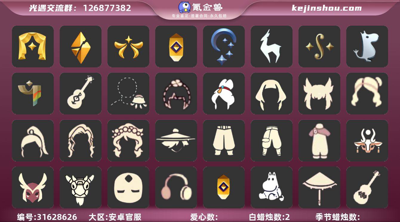 账号类型: 邮箱账号 季节已毕业: 梦想季,小王子季,潜海季,表演季,破晓季,欧若拉季,集结季,夜行季,追忆季,归巢季,九色鹿季,筑巢季 完成地图: 晨岛,云野,雨林,霞谷,暮土,禁阁 珍稀物品: 白枭,透明蝶翼斗,玫瑰花,彩虹围巾 礼包: 蝙蝠套,巫师,围巾,绊爱,鹿角,蜘蛛斗,秋千,茶桌,茶壶,白绒金,女巫裙,福娃,跷跷板,小船,吉他,雪花球,绒帽,橘子,贝壳,黄伞,红伞,兔子,南瓜,枯角,雪花,竖琴,水母,星月头饰,新年裤,四叶草,创始人,蛛网朋克 裤子: 武士裤,背带裤,搓澡巾,王子服,蓝绿裤,飞天裤,筑巢季·裤子 面具: 凤凰面具,贴花面具,呼吸面具,夜行毕业面具,黄眉企鹅面具 面饰: 红耳机,黑框眼镜 项链: 围巾 发型: 归巢毕业发型,若笠,虚荣,单侧绑发,小王子发型,留辫蘑菇头,飞天盘发 头饰: 行军锅头盔,蓝色音乐会,平顶帽 斗篷: 海洋斗,蟑螂斗,绿芽,粉红绒毛斗篷,遥鲲斗篷,黄色连帽披风,燕尾斗篷,冥龙斗篷 配饰: 雨伞,筑巢季·小手办,高音钢琴,相机,玫瑰花,鲲灯 亮点: 【优质装备】:表演季,白枭(帝企鹅发),武士裤,梦想季,小王子季(王子季),潜海季,破晓季,透明蝶翼斗,欧若拉季(欧若拉),归巢毕业发型(五塑彩羽发),行军锅头盔(六边锅帽子)(双耳锅帽子),筑巢季·小手办(光之子试衣),高音钢琴(白色高脚钢琴),集结季,玫瑰花,夜行季,追忆季,相机(季卡相机),彩虹围巾(五塑彩带斗),归巢季,九色鹿(九色鹿季),王子服(小王子套装),蓝绿裤(高领舞服),飞天裤(柔缎花边连)(九色鹿丝带裤),蟑螂斗(凤凰斗篷),围巾(肩带),筑巢季,蝙蝠套(蝙蝠斗篷)(南瓜头),绊爱(绊爱斗篷)(绊爱礼包),秋千(情人秋千),红耳机,围巾(小王子斗篷)(小王子围巾),鹿角(圣诞鹿角),蜘蛛斗(蛛丝斗篷)(蛛网斗篷),巫师(巫师帽),晨岛,云野,雨林,霞谷,墓土(暮土),禁阁,若笠(箬笠),筑巢季·裤子(设计师长袍),凤凰面具,贴花面具(丛林黑面具),呼吸面具(潜水面具),夜行毕业面具(棕熊面具),黄眉企...