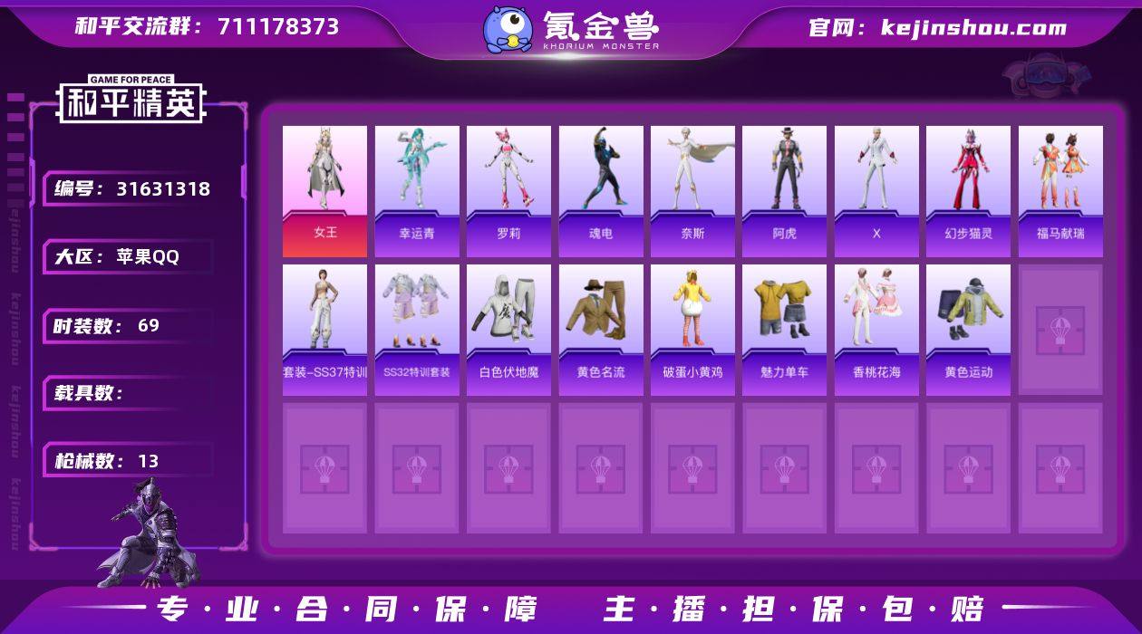 实名:可二次实名 是否支持人脸包赔:不支持 粉装数量:1 时装数:69 枪械数:13 女王 狙击之神,阿虎,魂电,罗莉,奈斯,X,幸运青,幻步猫灵,福马献瑞,SS37特训,白色伏地魔,黄色名流,黄色运动,魅力单车,破蛋小黄鸡,SS32特训套装,香桃花海 卖家说:古墓还有100多个石头