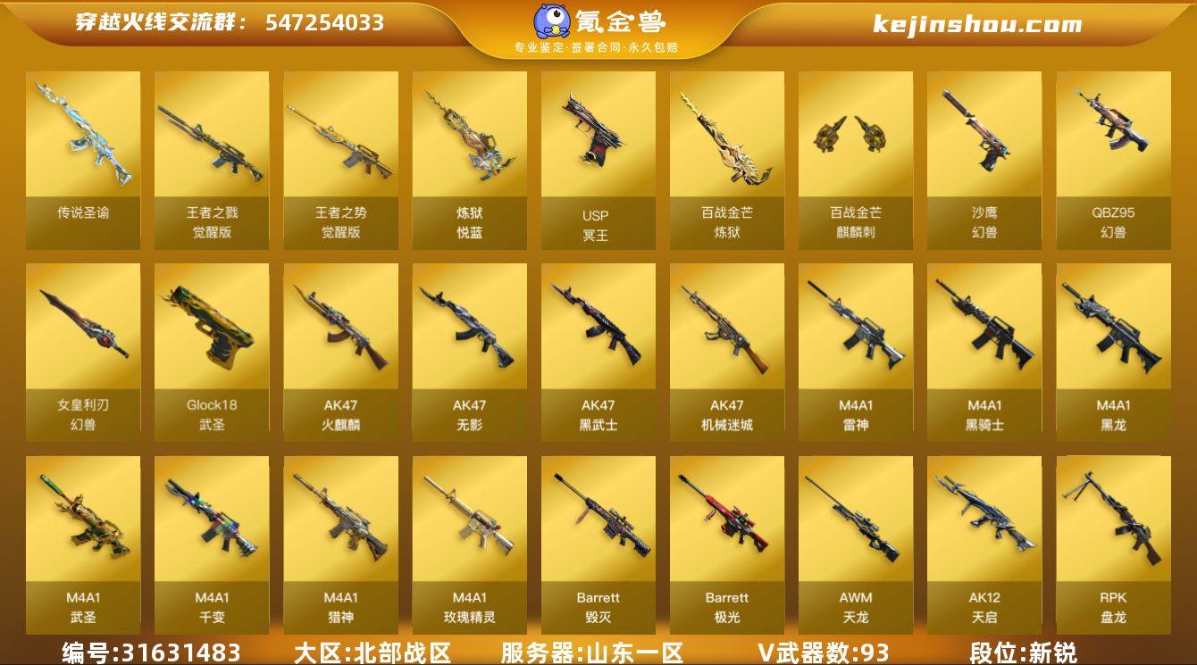 山东一区-101V-3王者武器数-0炫金武器数 【传说武器】:传说圣谕 【热门武器】:传说圣谕,死亡之眼,荣耀世冠-雷神,M4A1-黑骑士*2,汤姆逊-烈龙*7,RPK-盘龙,加特林-炼狱*2,沙鹰-修罗*6,高爆手雷-幻兽*5 【王者炫金武器】:炼狱-悦蓝 【音效卡】:M4A1-黑骑士音效卡,沙鹰-修罗-盛典舞曲音效卡*2,Barrett-碧霄极光音效卡,炼狱-百战金芒-庆典舞曲音效卡 【皮肤】:金色蔷薇-电竞之星 皮肤,Kar98K-星神-冠军之星皮肤,雷神-暗月,雷神-能量核心,雷神-机甲刑天皮肤,雷神-维纳斯皮肤,M4A1-再燃火线,雷神-神秘按键 皮肤,毁灭-暗月*3,毁灭-神秘黑洞皮肤,毁灭-百城浙江 皮肤,黑龙-能量核心,黑龙-暗月,无影-暗月*3,死神-秘银*2,天启-暗月*2,天龙-秘银*2,天龙-能量核心,极光-能量核心*2,修罗-能量核心*2,修罗-百战金芒 皮肤,天神-暗月*4,屠龙-春桃 皮肤,轻型军用手斧-再燃火线 【角色】:零,葵,樱,蝴蝶,王者之瞳,乔伊教练,初恋灵狐,潘多拉-甜心教官,铁骑荣耀,樱-缤纷夏日 【人偶武器】:迷你钢铁终结者,迷你救赎猎手,异变清道夫-蛇影双骄,加特林-机械猎手,AWM-灵狐-15周年嘉年华,COP-旗袍,M4A1-刀锋,迷你生化手雷,巴雷特-赏金猎人 【暴走生化】:死亡之眼,超级对讲机 【挑战大师】:激光毁灭者III-白马银枪,激光毁灭者III,神圣爆裂者-末日III 【英雄级武器】:M4A1-千变,AK47-火麒麟*2,M4A1-黑龙,M4A1-雷神*3,M4A1-黑骑士*2,AK47-无影*3,AK47-黑武士,AK12-天启*2,M4A1-武圣,AK47-机械迷城,M4A1-玫瑰精灵,QBZ95-幻兽,M4A1-猎神,王者之势-觉醒版,王者之戮-觉醒版,AK-47-猩红传说,荣耀世冠-雷神,AWM-天龙*2,Barrett-毁灭*2,Barrett-极光,RPK-盘龙,加特林-炼狱*2,炼狱-百战金芒,汤姆逊-烈龙*7,沙鹰-修罗*6,沙鹰-天神,破空枪刃,沙鹰-幻兽*5,USP-冥...