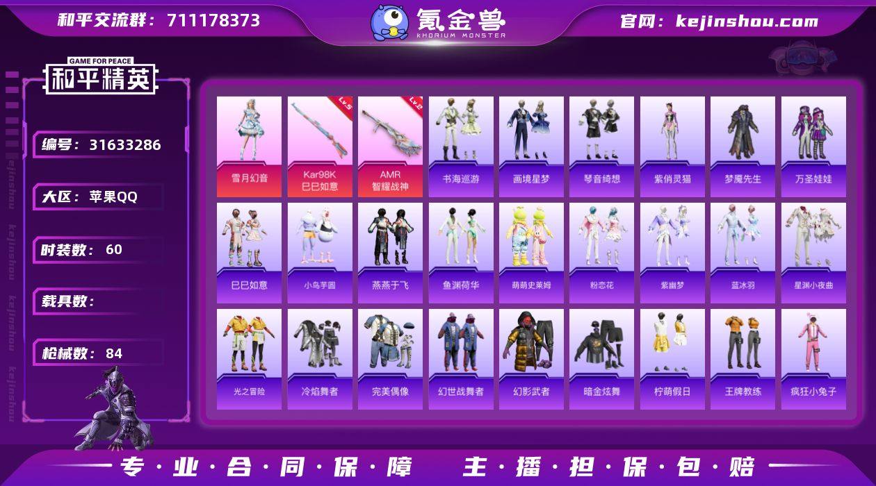苹果 手Q-2粉装-3特效枪-0载具-1粉色飞行器-21860热力值-2王牌印记-60套装-84枪皮LK262176 【粉色套装】:粉装-雪月幻音 【粉色枪皮等级】:Kar98K-巳巳如意(五级),AMR-智耀战神(二级) 【粉色枪皮】:Kar98K-巳巳如意,Mk14-福马献瑞,AMR-智耀战神 【粉色飞行器】:炫彩糖果飞行器 【粉色降落伞】:炫光之旅降落伞,幻影飞狐降落伞,绯果甜心降落伞,极意拳锋降落伞,炫彩糖果降落伞 【稀有套装】:套装-巳巳如意,套装-小鸟芋圆,套装-雪国风尚,套装-炫彩糖果,套装-燕燕于飞,套装-鱼渊荷华,套装-萌萌史莱姆,套装-粉恋花,套装-紫幽梦,套装-蓝冰羽,套装-星渊小夜曲,角色-紫俏灵猫,套装-书海巡游,套装-画境星梦,套装-琴音绮想,套装-橘猫汽水,套装-雨过天青,套装-红釉青花 【稀有枪皮】:AUG-冰晶雪宝,AKM-破晓战魂,SCAR-L-玉兔迎春,M416-红色方程式,M416-蓝色火焰,M762-彩虹符号,M762-幻影飞狐,G36C-星穹咏叹调,ACE32-画境星梦,UZI-天降萌叽,UZI-幻影飞狐,UMP45-生命誓言,UMP45-绒宝小鹅,UMP45-极意拳锋,汤姆逊-天降萌叽,汤姆逊-耀粉歌者,MP5K-画境星梦,P90-巳巳如意,SKS-炫彩节奏,Mini14-耀粉歌者,Mk14-幻星舰长,SLR-圣穹绘梦,M417-幻影飞狐,M200-六号稻草人,M1加兰德-画境星梦,S686-生命誓言,S686-巳巳如意,DBS-彩虹符号,AA12-G-画境星梦,M249-萌萌史莱姆,沙漠之鹰-圣穹绘梦,TMP-9-萌萌史莱姆,平底锅-画境星梦,破片手榴弹-巳巳如意 【其他套装】:套装-光之冒险,套装-冷焰舞者,套装-完美偶像,套装-幻世战舞者,套装-幻影武者,套装-暗金炫舞,套装-柠萌假日,套装-王牌教练,套装-疯狂小兔子,套装-白熊同盟,套装-破晓战魂,套装-破蛋小黄鸡,套装-竞技名士,套装-缤纷果语,套装-蓝色运动,套装-长空猛禽,套装-魅力单车,套装-清新柠檬,套装-梦魇先生,...