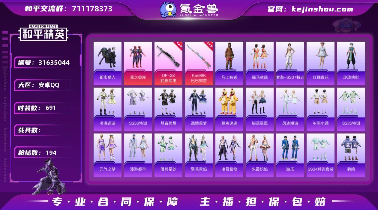 实名:可二次实名 是否支持人脸包赔:支持 粉装数量:1 特效枪数量:2 时装数:691 枪械数:194 都市猎人 星之彼岸 五级DP-28-豹影疾电,五级Kar98K-巳巳如意 狙击之神,马上有钱,福马献瑞,红釉青花,SS37特训,雨过天青,玲珑侠影,画境星梦,琴音绮想,书海巡游,SS36特训,萌鸡速递,风迹短诗,秘语星愿,SS35特训,午间小调,元气之梦,漫游都市,薄荷星砂,凌霄紫焰,擎苍青焰,SS34特训套装,游乐,朱霞炽焰,暗黑骑手,冰川特警,冰冻风暴,缤纷果语,滨海厨神,白糯汤圆,白色伏地魔,白熊同盟,彩虹兔,长空猛禽,潮流炫酷,春日漫步,顶瓜瓜,蝶变,大橘大利,都市猎人,都市漫游者,风暴特警,绯格组合,粉红小猪,疯狂小兔子,粉恋花,福星高照,飞行日记,龟仙人,光之冒险,幻彩翩翩,海岛探路者,鹤鸣,湖蓝色名流,活力之心,怀庆长公主,幻世保卫者,黑色伏地魔,黄色伏地魔,黄色名流,黄色运动,红色运动,幻世战舞者,火舞潮人,幻影武者,极地朋克,惊鸿侠骨,娇憨猪猪,竞技达人朋克,竞技名士,吉莉礼服,街舞达人,锦衣飞扬,金羽特工,空岛之星,快乐星愿,蓝冰羽,蓝彩潮人,龙的传人,六六大吉,浪漫天命,蓝色守护者,蓝色运动,龙腾端午,恋语绒绒,冷焰舞者,漫步者,猛禽,妙红点点,萌黄之夏,魅力单车,麻辣教官,懵萌河马,萌趣咩咩,萌趣颜团子,霓虹街区,怒火燎原,柠萌假日,牛气冲天,牛气满满,破蛋小黄鸡,破晓战魂,青春校园,轻风白浪,绮丽涂鸦,青年教官,青涩时光,清新柠檬,青玉碎影,云朵鹅,荣耀,人气偶像,燃烧卡路里,热血青春,热血骑手,忍者信条,生化防暴队,深蓝色名流,森林游猎者,沙漠兵团,神气柴柴,SS14特训,SS15特训,SS16特训,SS20特训,SS21特训,SS22特训,SS23特训,SS24特训,SS25特训,SS26特训,SS27特训,SS28特训,SS29特训,SS31特训套装,SS32特训套装,SS33特训套装,巳巳如意,探宝勇士,甜蜜熊情侣,甜梦熊熊,涂山之恋,特训学院,田园牧歌,特战英豪,特种颜团子,特战装甲,完美偶像,王牌教练,无暇誓言,雪绒豹,旭日情侣,血色贵族,香榭午后,耀粉歌者,玉兔迎春,野性战心,鹰眼刺客,耀眼新星,异域银装,战地督导,智谋强哥,紫幽梦,灼焰舞者 绝对恒星降落伞,炫彩糖果降落伞,炫彩糖果飞行器,星之彼岸飞行器,创世·救赎降落伞,幻影战神降落伞,快乐主宰降落伞 卖家说:诚信出