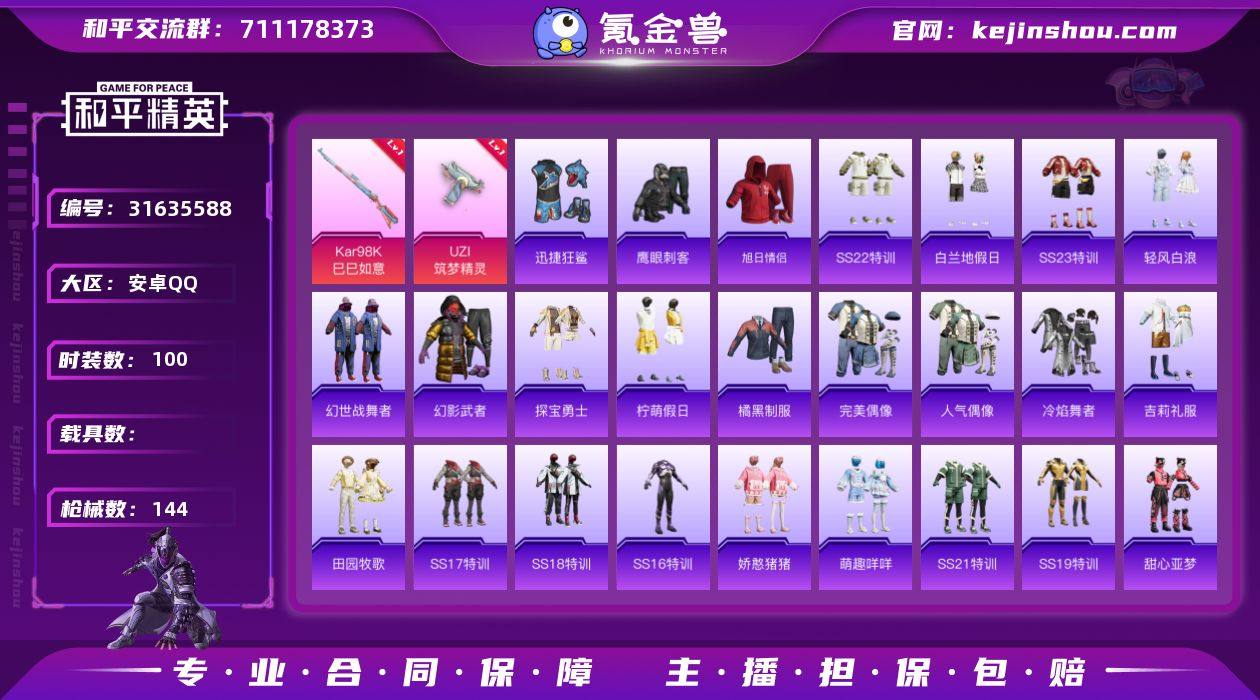 5特效枪1粉装101套装143枪皮36968热力值6王牌印记-地铁48点满天赋-7级UZI-筑梦精灵】Q等级24(1太阳) 安卓Q-1稀有1粉装5特效枪4热门101套装143枪皮 36968热力值 6印记 历史超级王牌6星 【1稀有】 AKM-缤纷海域 【1粉装】 星穹咏叹调 【5特效枪】 Kar98K-巳巳如意 (5级) DP-28-豹影疾电 (5级) Mk14-甜梦熊击 (5级) AMR-智耀战神 (6级) UZI-筑梦精灵 (7级) 【4热门】角色-瑰丽爱神 龙鬼突击队 疯狂小兔子 猛禽 角色-拉斐尔 龟仙人 鹰眼刺客 迅捷狂鲨 M24-奇异狩猎者 【2头盔】 梦幻火箭头盔 深海小丑鱼头盔 【1背包】 梦幻火箭背安卓Q区-1粉装-5特效枪-36968热力值-6王牌印记-101套装-144枪皮【优质套装】: 星穹咏叹调【特效枪等级】:Kar98K-巳巳如意(五级- Kar98K-巳巳如意)UZI-筑梦精灵(七级- UZI-筑梦精灵)【优质武器皮肤】: Kar98K-巳巳如意 UZI-筑梦精灵【稀有武器皮肤】: DBS-乌木金纹 SCAR-L-海盐豹豹 Kar98K-巳巳如意 野牛-雏菊兔兔 Mk14-冰河战士 平底锅-雏菊兔兔 M762-雏菊兔兔 Mini14-雏菊兔兔 R1895-雏菊兔兔 UZI-冰河战士 M16A4-冰河战士 20-H-乌木金纹 UZI-筑梦精灵 蜜獾-乌木金纹 M416-蓝色火焰 M416-糯团青竹 M416-绯红前夜 AKM-彩虹符号 AKM-缤纷海域 AKM-虎虎生威 AKM-霓虹街区 SCAR-L-红色方程式 SCAR-L-玉兔迎春 SCAR-L-夜灯 SCAR-L-炫彩节奏 M16A4-红色方程式 M16A4-幻世战舞者 M16A4-甜心亚梦 GROZA-影袭 GROZA-田园牧歌 GROZA-彩虹符号 AUG-耀粉歌者 AUG-天降萌叽 QBZ-彩虹符号 M762-绯红前夜 M762-天降萌叽 Mk47-乌木金纹 G36C-乌木金纹 AC-VAL-天降萌叽 AC-VAL-甜心亚梦 AC-VA