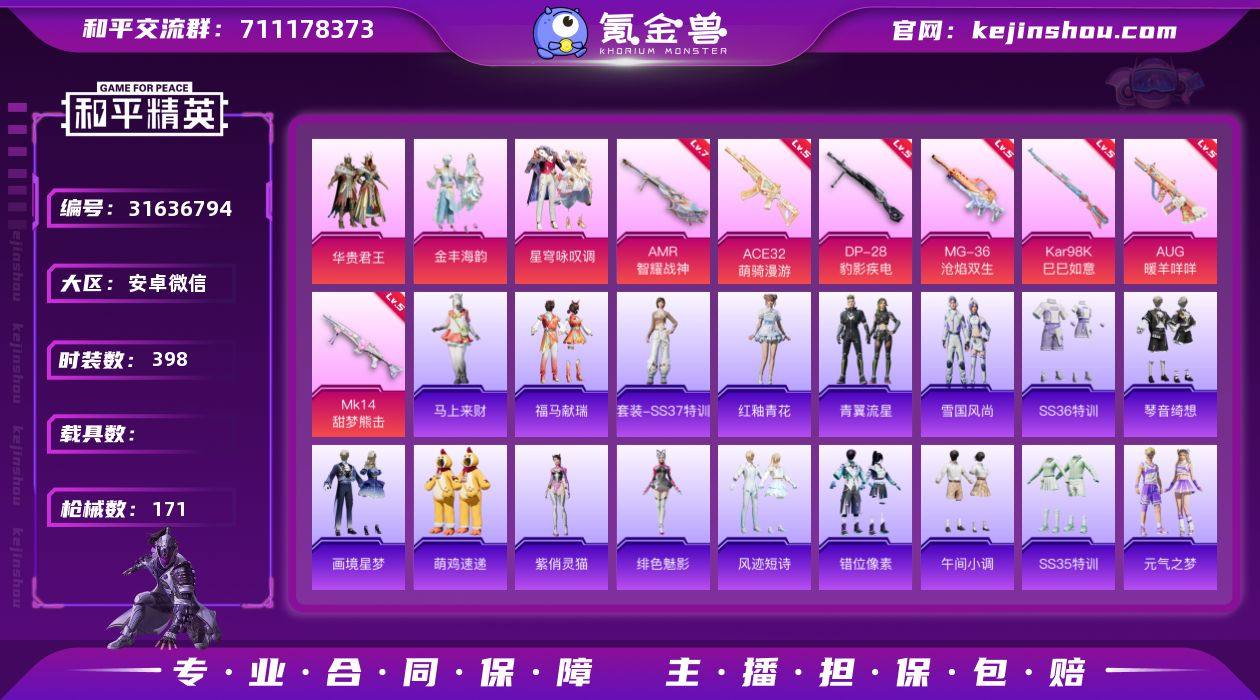 实名:可二次实名 是否支持人脸包赔:支持 粉装数量:3 特效枪数量:7 时装数:398 枪械数:171 华贵君王,金丰海韵,星穹咏叹调 七级AMR-智耀战神,五级ACE32-萌骑漫游,五级DP-28-豹影疾电,五级MG-36-沧焰双生,五级AUG-暖羊咩咩,五级Kar98K-巳巳如意,五级MK14-甜梦熊击 狙击之神,马上来财,福马献瑞,红釉青花,SS37特训,青翼流星,雪国风尚,画境星梦,琴音绮想,SS36特训,炫彩糖果,绯色魅影,萌鸡速递,紫俏灵猫,错位像素,风迹短诗,SS35特训,午间小调,元气之梦,薄荷星砂,凌霄紫焰,擎苍青焰,SS34特训套装,夜幕侵蚀,游乐,朱霞炽焰,冰川特警,缤纷果语,滨海厨神,冰河战士,白糯汤圆,白色伏地魔,彩虹兔,雏菊兔兔,长空猛禽,潮流炫酷,春日漫步,超人强,纯真浪花,顶瓜瓜,蝶变,大橘大利,粉恋花,光之冒险,海岛探路者,湖蓝色名流,湖畔霞光,怀庆长公主,黑色伏地魔,黄色运动,竞技达人朋克,竞技名士,街头风暴,空岛之星,蓝冰羽,蓝彩潮人,六号稻草人,龙魂突击队,萝兰蝴蝶,蓝调潮影,恋语绒绒,冷焰舞者,Mark.06,猛禽,魅力单车,蜜露汐语,弄潮海豚,霓虹热舞,柠萌假日,破蛋小黄鸡,绮丽涂鸦,青团波波,云朵鹅,绒宝小鹅,热情海星,深蓝色名流,SS27特训,SS28特训,SS29特训,SS30特训套装,SS31特训套装,SS32特训套装,SS33特训套装,巳巳如意,石蕴玉辉,天籁歌者,糖糖葫芦,王牌教练,顽皮玉兔,许七安,先驱飞行员,雪绒豹,香桃花海,星途旅人,鱼渊荷华,燕燕于飞,异域银装,智谋强哥,紫幽梦 罪夜之冕降落伞,极意拳锋降落伞,炫彩糖果降落伞,炫彩糖果飞行器,异瞳寒姬降落伞,幻星舰长飞行器,橘柚倾心降落伞,临安公主降落伞,时光之誓降落伞,时光之吻降落伞,星穹咏叹调降落伞,雪月幻音降落伞