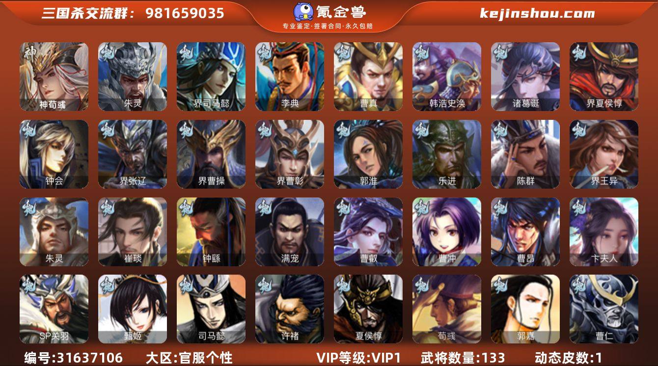 VIP等级: VIP1 官阶: 先锋将军 武将数量: 133 动态皮肤数量: 1 神将: 神荀彧 魏国武将: 徐庶,张辽,SP关羽,SP贾诩,卞夫人,曹昂,曹操,曹冲,曹丕,曹仁,曹叡,满宠,钟繇,郭嘉,荀彧,崔琰,朱灵,界王异,陈群,乐进,郭淮,界曹彰,夏侯惇,界曹操,许褚,界张辽,钟会,界夏侯惇,诸葛诞,司马懿,甄姬,徐晃,韩浩史涣,曹真,典韦,夏侯渊,李典,于禁,邓艾,界司马懿,朱灵(国战) 蜀国武将: 关索,徐庶,赵云,彭羕,界刘备,刘封,黄月英,关羽,吴懿,张飞,魏延,界法正,刘禅,界赵云,SP孙尚香,卧龙诸葛,周仓,界关兴张苞,诸葛亮,界马岱,关平,庞统,马超,廖化,关兴张苞,孟获,黄忠,刘备,界马超,马良,彭羕(国战),SP甘夫人,势陈到,势陈祗 吴国武将: 周泰,吕蒙,顾雍,界朱治,界孙权,孙尚香,程普,大乔,韩当,陆逊,诸葛瑾,朱然,吕范,太史慈,虞翻,界黄盖,孙鲁班,界潘璋马忠,孙权,界甘宁,界韩当,吴国太,甘宁,孙坚,孙鲁育,凌统,步练师,周瑜,小乔,潘璋马忠,黄盖,界陆逊,徐盛,张昭张纮,孙邵 群国武将: 伏完,华雄,袁术,刘繇,于吉,吕布,李儒,公孙瓒,樊稠,界袁术,界华佗,贾诩,庞德,谋卢植,张角,袁绍,华佗,貂蝉,伏皇后,颜良文丑,何进,邹氏,马腾,友庞统,势田丰