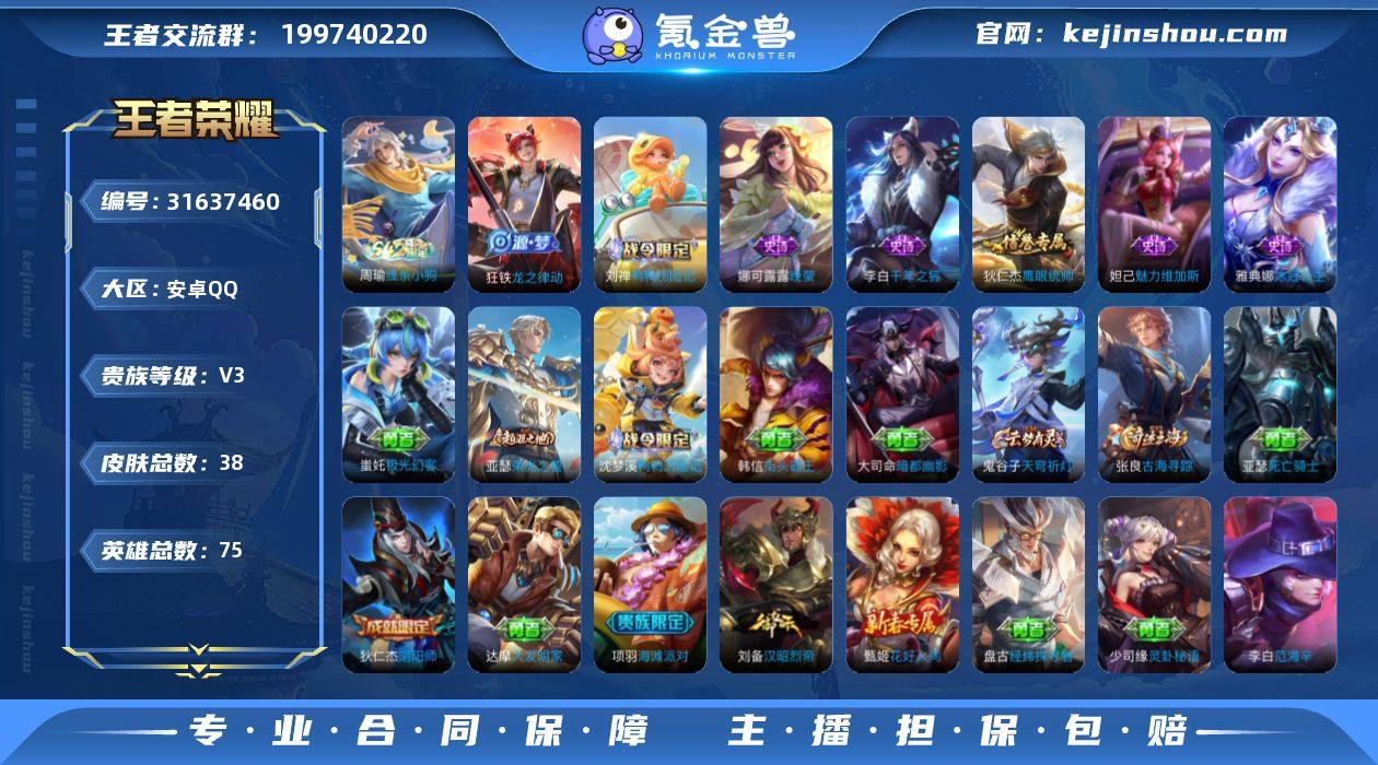 贵族等级:V3 典藏皮肤数:0 珍品无双皮肤数:0 无双皮肤数:0 珍品传说皮肤数:0 传说皮肤数:0 史诗皮肤数:7 皮肤数:38 英雄数:75 段位:至圣王者 卖家说:低场次 胜率高 高评分