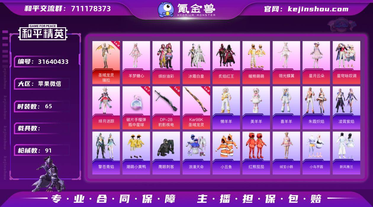 苹果 微信-1神装-3粉装-7特效枪-3载具-4粉色飞行器-29919热力值-1王牌印记-46套装-91枪皮 【红色神装等级】:魔童闹海-哪吒(二级) 【红色角色神装】:魔童闹海-哪吒 【热门品类】:套装-都市猎人,套装-深海小丑鱼,套装-小丑鱼,套装-奇异狩猎者 【粉色套装】:粉装-未来战士,粉装-星之彼岸,角色-羊梦糖心 【粉色枪皮等级】:SCAR-L-魔童闹海 哪吒(三级),Vector-绯穹魔姬(四级),汤姆逊-热量炸弹(五级),P90-魔童闹海 敖丙(三级),Mk14-甜梦熊击(五级),DP-28-豹影疾电(五级),MG-36-沧焰双生(五级) 【粉色载具】:星梦玉骢,黑曜夜骑,冰绡玉鳞 【粉色枪皮】:SCAR-L-魔童闹海 哪吒,Vector-绯穹魔姬,汤姆逊-热量炸弹,P90-魔童闹海 敖丙,Mk14-甜梦熊击,DP-28-豹影疾电,MG-36-沧焰双生 【粉色飞行器】:灵猫魔法师飞行器,飞天猪飞行器,灵珠游龙飞行器 【粉色降落伞】:未来战士降落伞,星之彼岸降落伞,星梦奇缘降落伞,灵猫魔法师降落伞,桃源时光降落伞,绯穹魔姬降落伞,无垠阁降落伞,喜羊羊与灰太狼降落伞,魔童闹海 哪吒降落伞,魔童闹海 敖丙降落伞,异瞳寒姬降落伞,炫彩糖果降落伞 【稀有套装】:角色-虚空骇客,角色-绛羽幽主,角色-夜瞳黯灵,套装-朱霞炽焰,套装-凌霄紫焰,套装-擎苍青焰,角色-蛇蝎美人,玩偶服-喜羊羊,角色-敖闰 【稀有枪皮】:AKM-星之彼岸,AKM-破晓战魂,AKM-灵猫魔法师,M16A4-幻世战舞者,SCAR-L-夜灯,SCAR-L-未来战士,M416-蓝色火焰,GROZA-恐龙拽拽,AUG-耀粉歌者,M762-奇异狩猎者,Mk47-虚空骇客,蜜獾-绯穹魔姬,ARX-凌霄紫焰,UZI-桃源时光,UMP45-夜灯,汤姆逊-天降萌叽,汤姆逊-灵猫魔法师,JS9-凌霄紫焰,M24-未来战士,SKS-迅猛狂鲨,VSS-星之彼岸,VSS-未来战士,VSS-虚空骇客,Mini14-穿刺龙虾,Mini14-金玉无双,Mini14-绯穹魔姬,AMR-喜羊羊与灰...