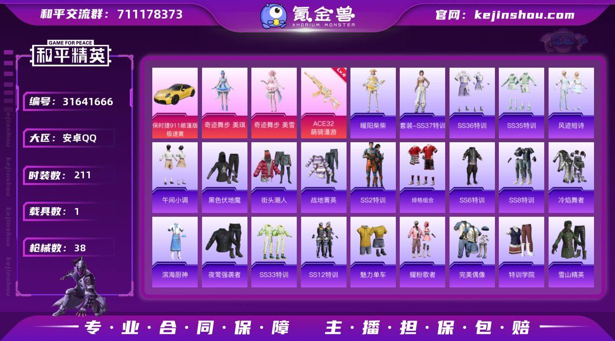 实名:可二次实名 是否支持人脸包赔:不支持 粉装数量:2 特效枪数量:1 载具数:1 时装数:211 枪械数:38 奇迹舞步-美琪,奇迹舞步-美雪 四级ACE32-萌骑漫游 保时捷911敞篷版(极速黄) 狙击之神,暖阳柴柴,SS37特训,SS36特训,风迹短诗,SS35特训,午间小调,北国孤狼,滨海厨神,绯格组合,疯狂小兔子,海滨突袭者,黑色伏地魔,竞技达人朋克,竞技勇士朋克,极速红龙,金鼠迎春,街头潮人,蓝彩潮人,冷焰舞者,魅力单车,霓虹街区,牛气满满,青涩时光,骑行爱好者,SS12特训,SS2特训,SS33特训套装,SS3特训,SS6特训,SS7特训,SS8特训,SS9特训,特训学院,完美偶像,夏日音浪,雪山精英,跃动心情,耀粉歌者,野性战魂,夜莺强袭者,战地菁英 虎痴许褚降落伞,炫彩糖果飞行器,无垠阁降落伞 卖家说:退游号