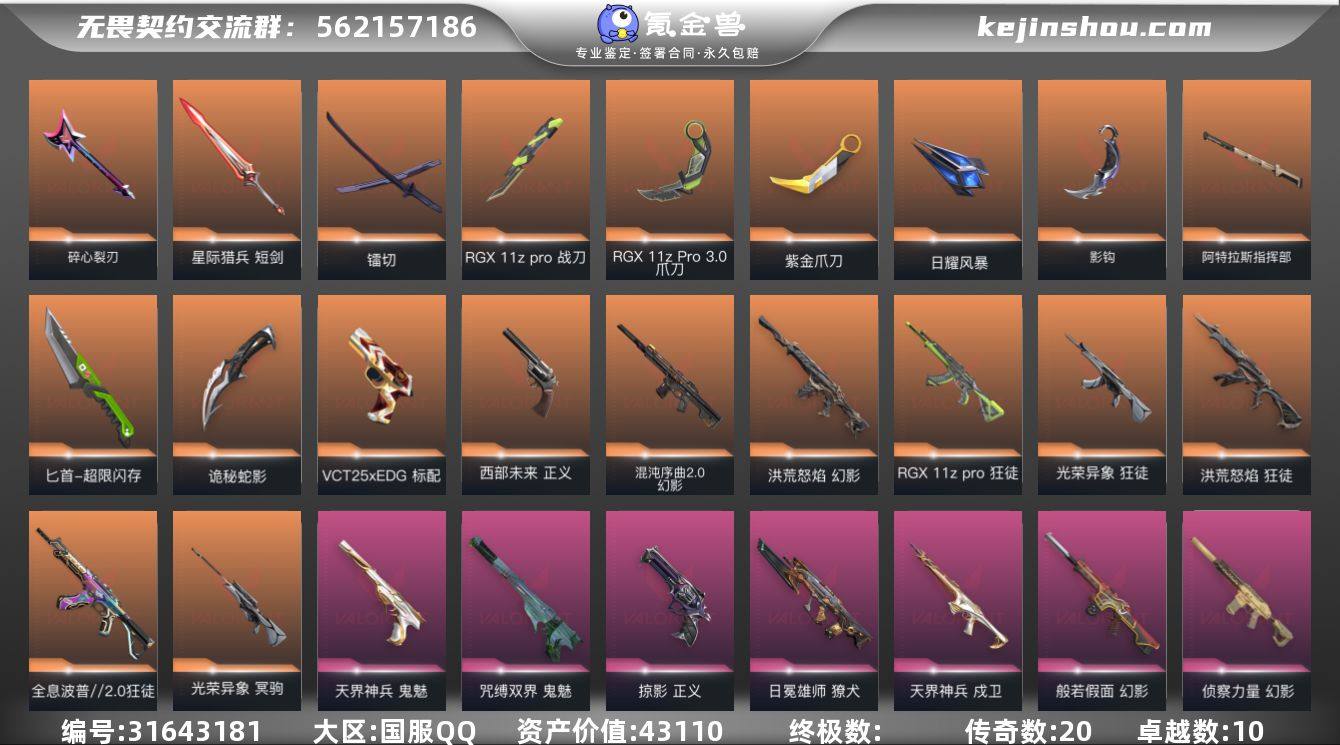 【游戏等级】Lv150【游戏段位】铂金I 影钩,RGX-11z-Pro-战刀,镭切,紫金爪刀,RGX-11z-Pro//3.0-爪刀,光荣异象-狂徒,RGX-11z-Pro-狂徒,混沌序曲//2.0-幻影,洪荒怒焰-幻影,洪荒怒焰-狂徒,全息波普//2.0-狂徒,离子武器//2.0-狂徒,天界神兵-戍卫,紫阙金琅-狂徒,侦察力量-幻影,般若假面-幻影,日冕雄师-獠犬,掠影-狂徒,光荣异象-冥驹,VCT25-x-EDG-标配,西部未来-正义,天界神兵-鬼魅,咒缚双界-鬼魅,掠影-正义